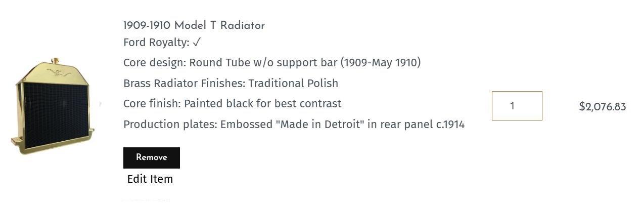 This radiator is a ROUND TUBE. If any of you have bought a new early T radiator from Brassworks you know there is the base price, then an add on for the Ford Royalty, then an add on for them polishing the radiator (you can get it unpolished and do that yourself....work, work, work), then an add on for them painting the core of the radiator black, etc, etc. The photo posted here is what this radiator costs on Brassworks. The price stated DOES NOT include shipping.