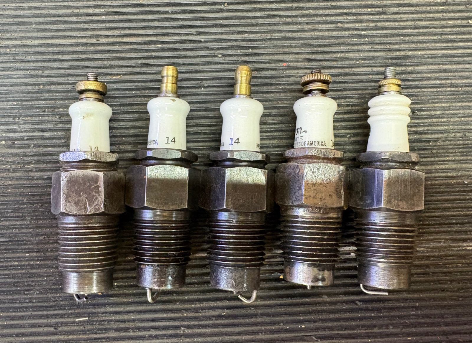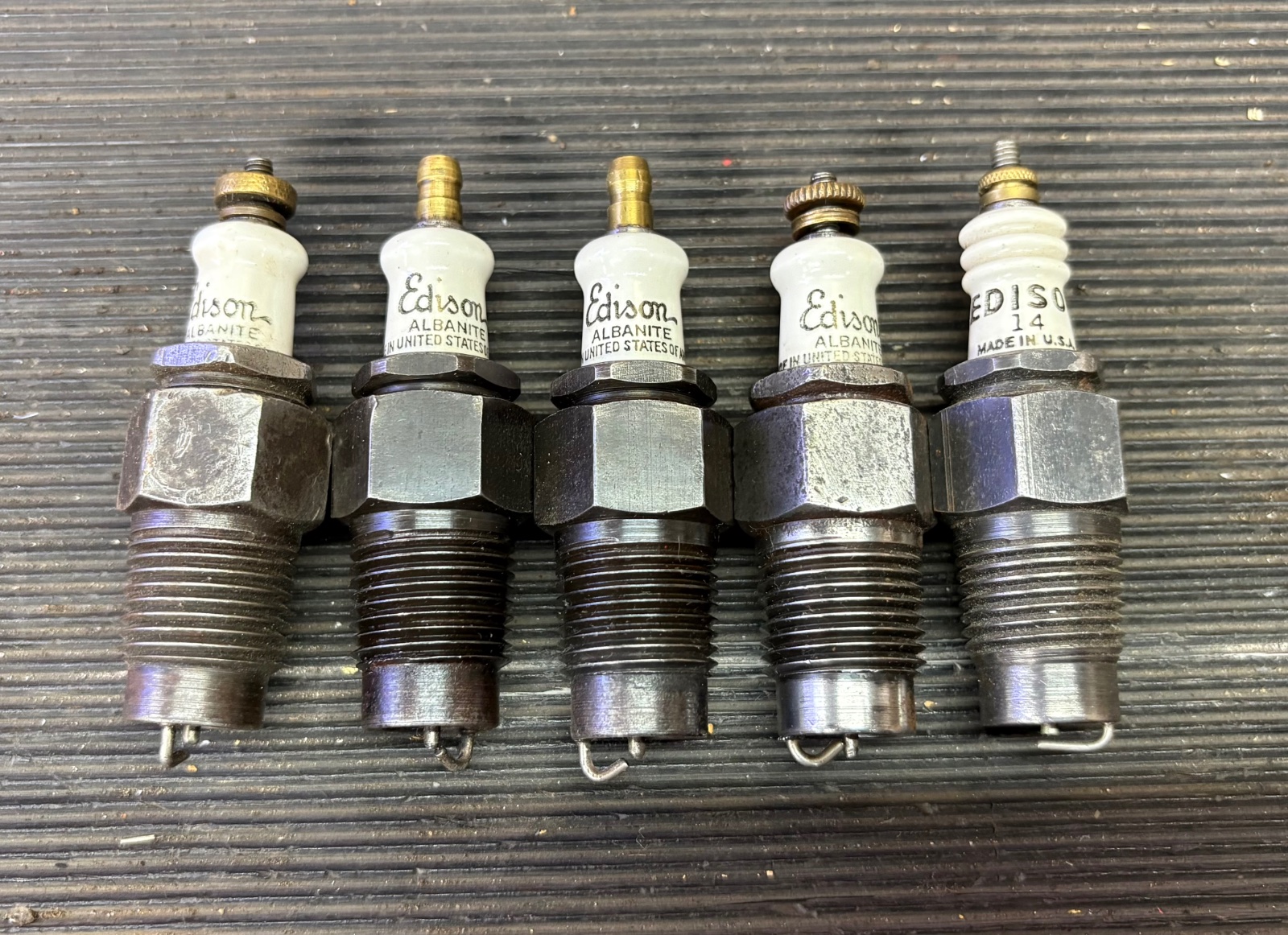 5 used Edison 14 spark plugs. Four of them match and the fifth one is a little different. All look to be in good shape.