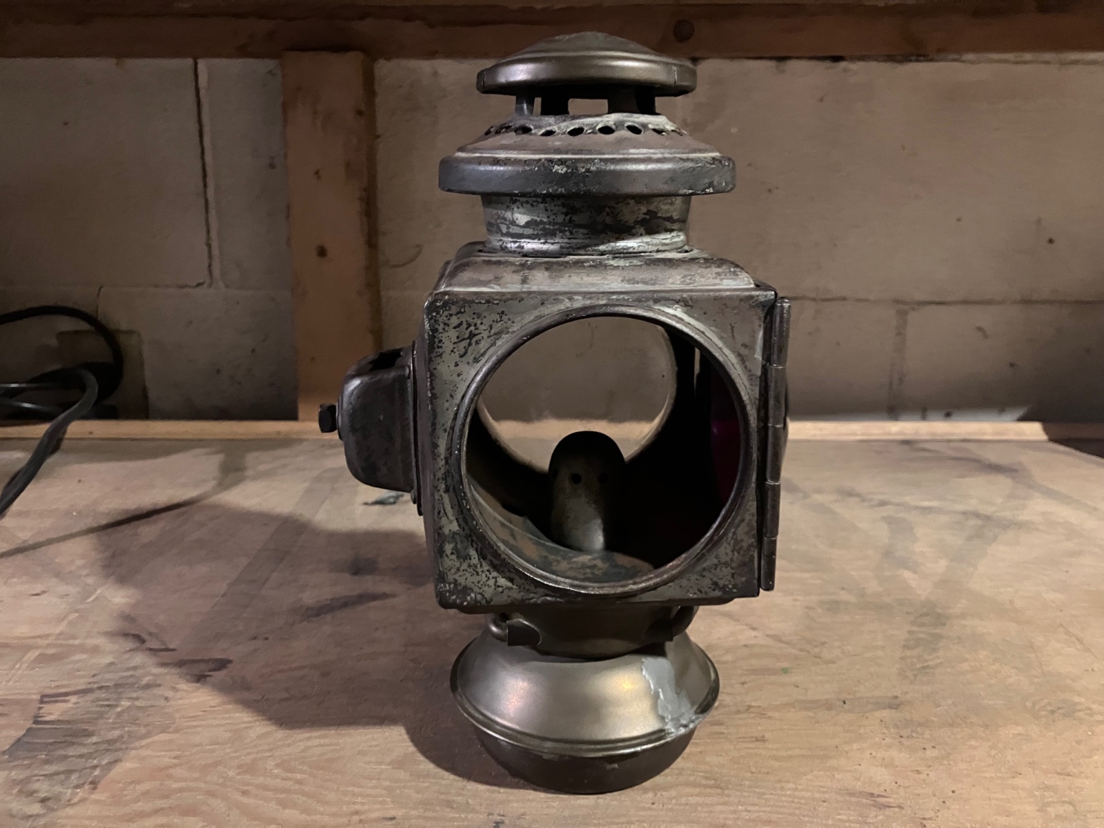 This a black and brass tail light. The body of the lamp is in real nice shape the chimney cap has some dents etc. The font looks like there was a solder repair. Missing the blue lense. Burner in tact and in real nice shape. Excellent candidate for restoration or a perfect piece for a unrestored original. $75 plus shipping