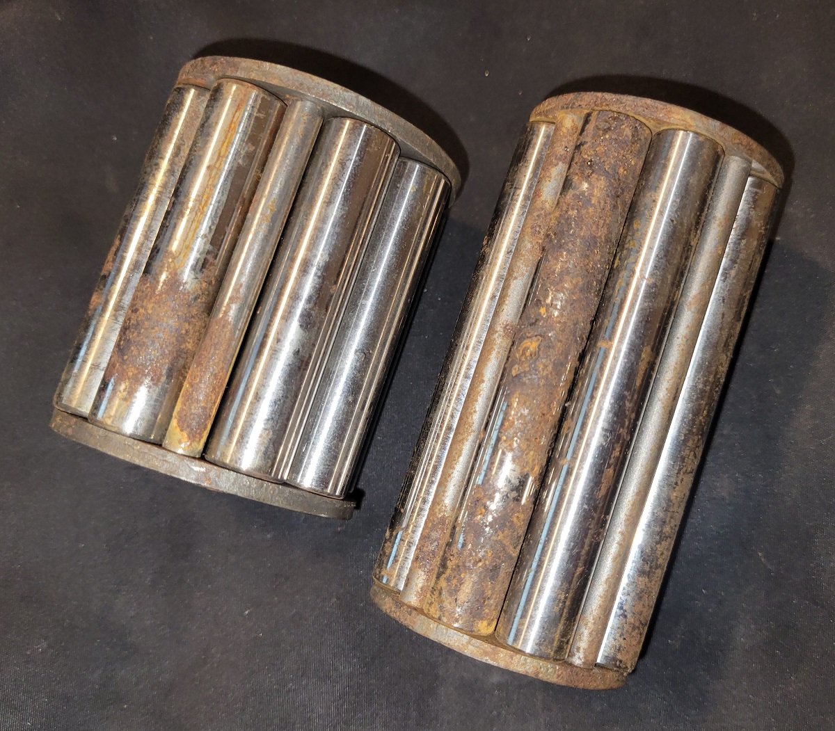 Free: A solid-roller driveshaft bearing and and axle bearing. These probably made around 1960 and were never installed. Solid roller bearings don't work very well on Model T's but they're cheaper to make than the original Hyatt bearings. There are some rust spots on these; I don't know how usable they are. I just thought I'd better offer them here before they go to scrap. They're yours if you pay shipping.