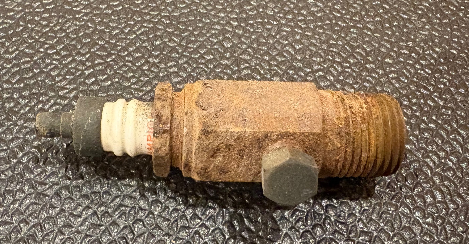Barn fresh Champion primer spark plug. Missing the primer cup and someone installed a plug in the hole years ago. Could also be used for an explosion whistle.