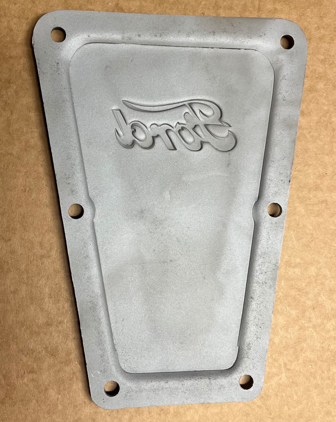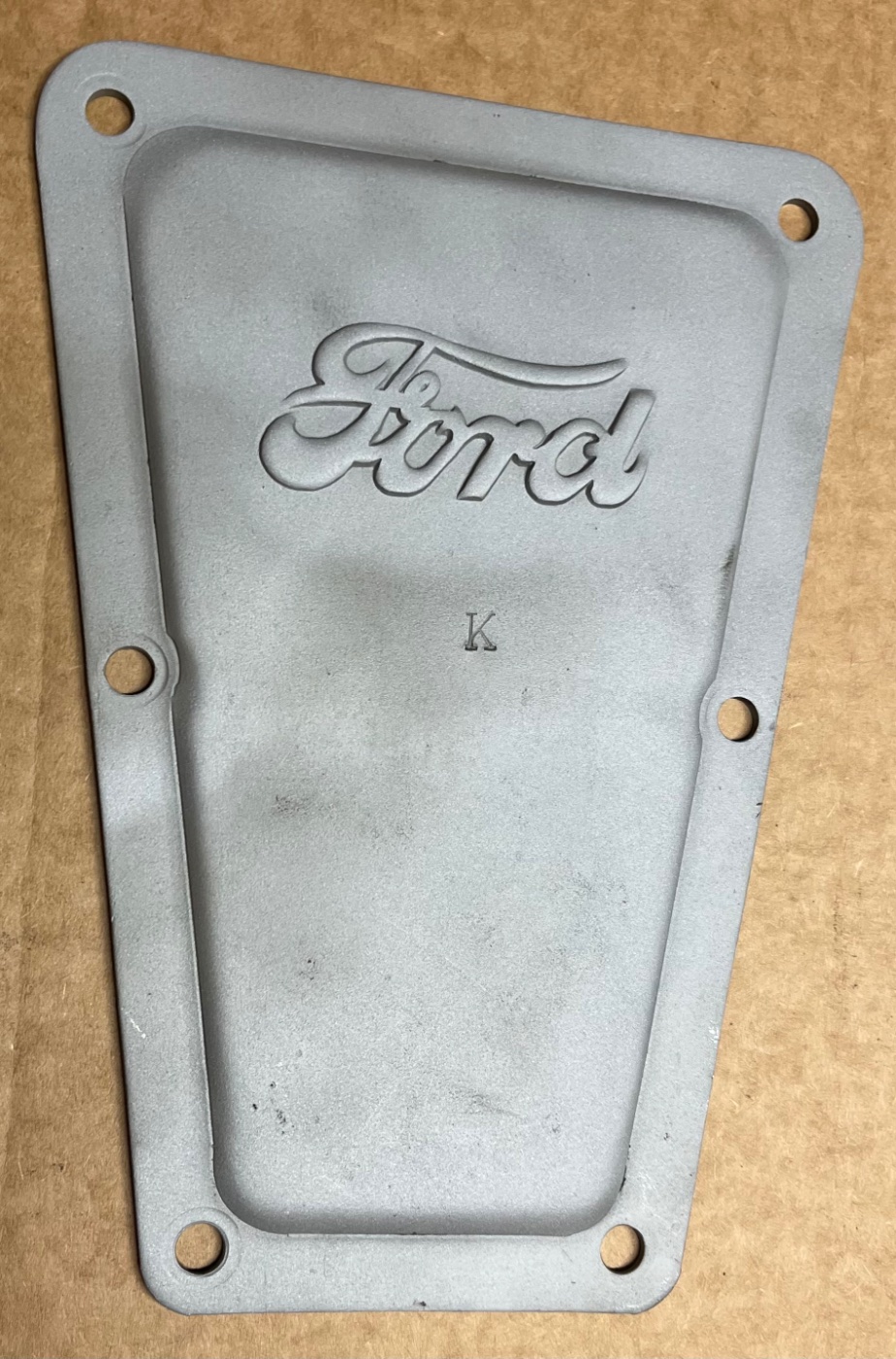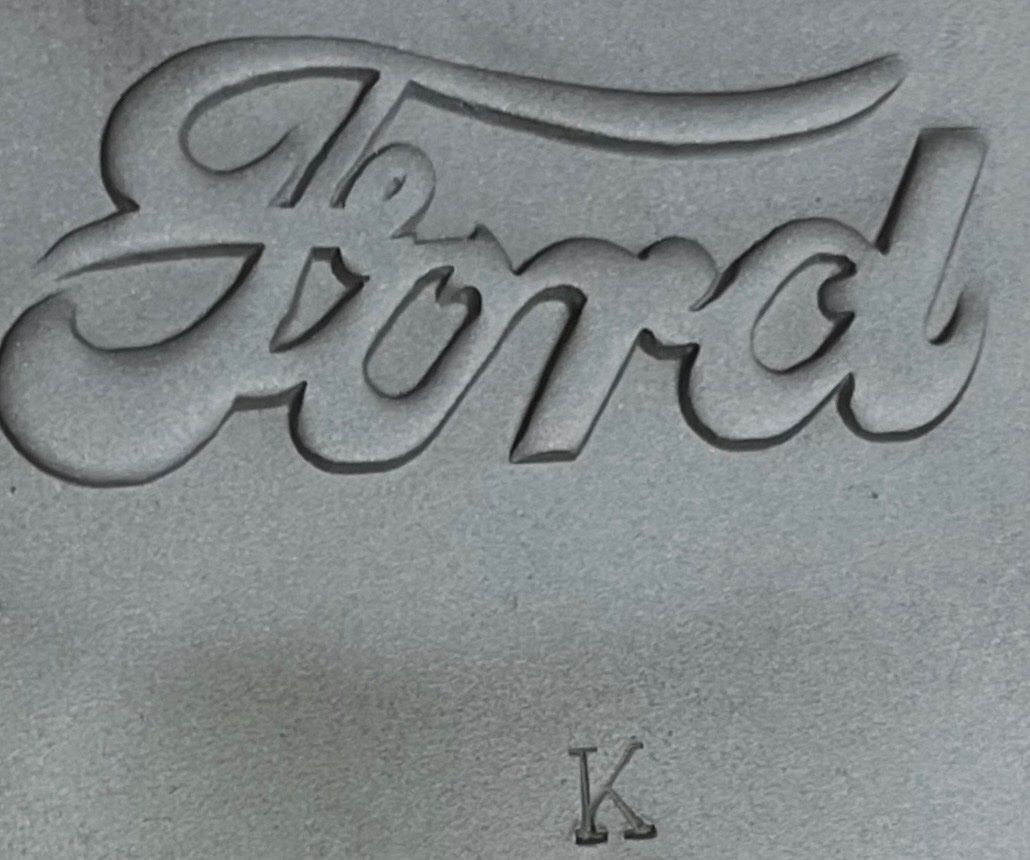 For Sale is a very nice “Ford Script” Transmission Door for late 1911-1912 tapered transmission cover. It is in excellent condition with no pitting and a very crisp script. It has been glass beaded. $175.00 plus shipping. Lang’s 1-800-872-7871