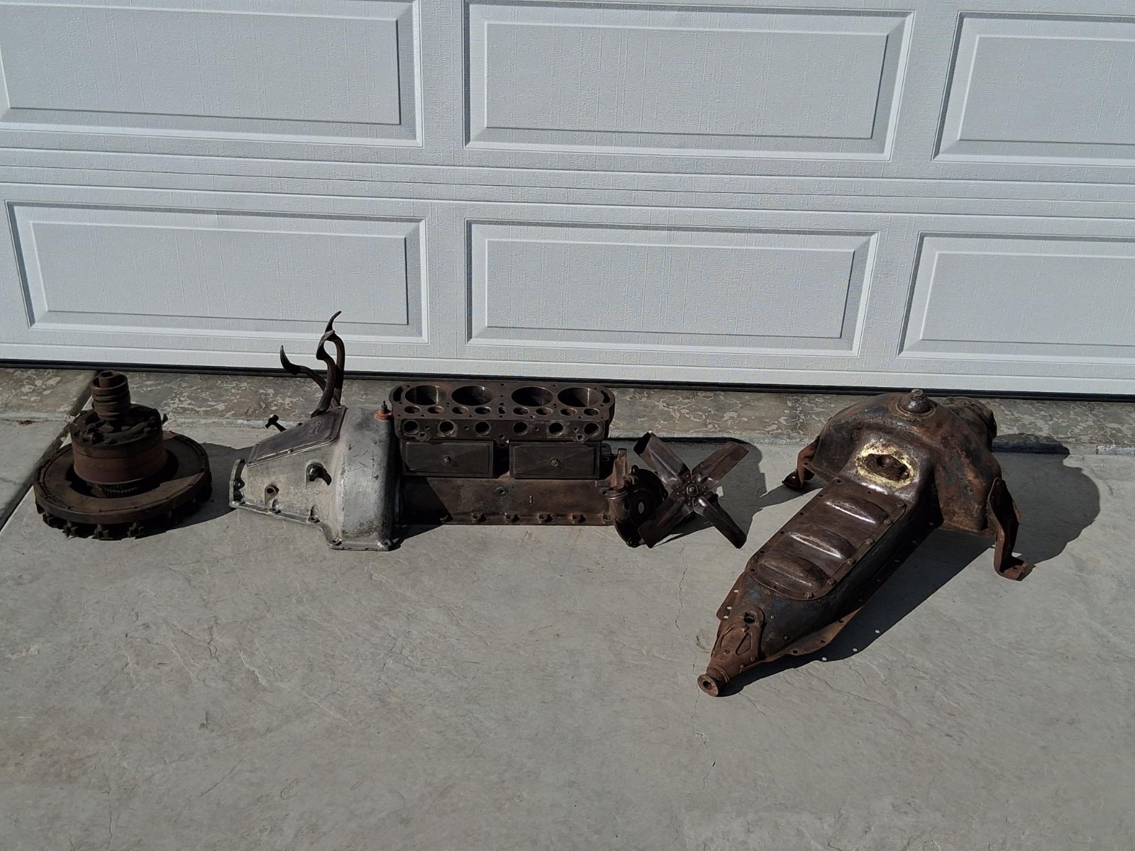 Everything in the first picture. Block with heavy valve doors, and timing gear cover; fan w/brass hub; seven rivet teacup pan; hogshead with pedals and Ford script inspection cover; complete transmission assembly. The block, going by the serial #97901 was assembled in March of '12. The casting date is not really legible. There are no cracks in the water jackets, but there is a chip in the pan mating flange on the left side that does not affect the mating surface. The cylinder bores have slight rust but no pitting and should clean up nicely. Several of the head bolt holes will need repairing and there is one bolt broken off at the block's surface. There is also some pitting on the block's deck in the combustion chamber area around the valves. There is no pitting on the head gasket surface. The hogshead is excellent with no cracks. It has the correct Ford script inspection cover. The pedals have a fair amount of wear to them. The pan is the correct seven rivet, teacup pan with tapered pan arms. It does have a crack in both of the block/hogshead corners that would be easily repaired. Also, three of the nose piece rivets have been replaced with flat head bolts and square nuts. The pan is solid with only surface rust. The fan blades are a bit banged up and will need to be flattened/straitened but don't have any cracks. The transmission is a complete assembly with flywheel and magnets. The drums have only slight surface rust and no pitting at all. The brake drum does have a little scoring from the band rivets. There is minimal wiggle in the triple gears or drums on their respective shafts.