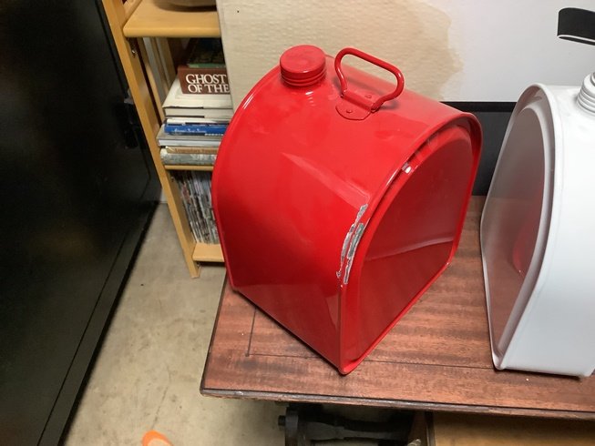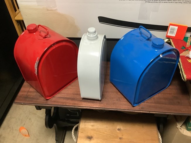 Set of Gas,Oil,Water Cans - No Holder - Red Can needs paint touch up after falling off shelf onto my forehead asking $300.00 plus shipping give me a call 50 three-8 two 4-268 one