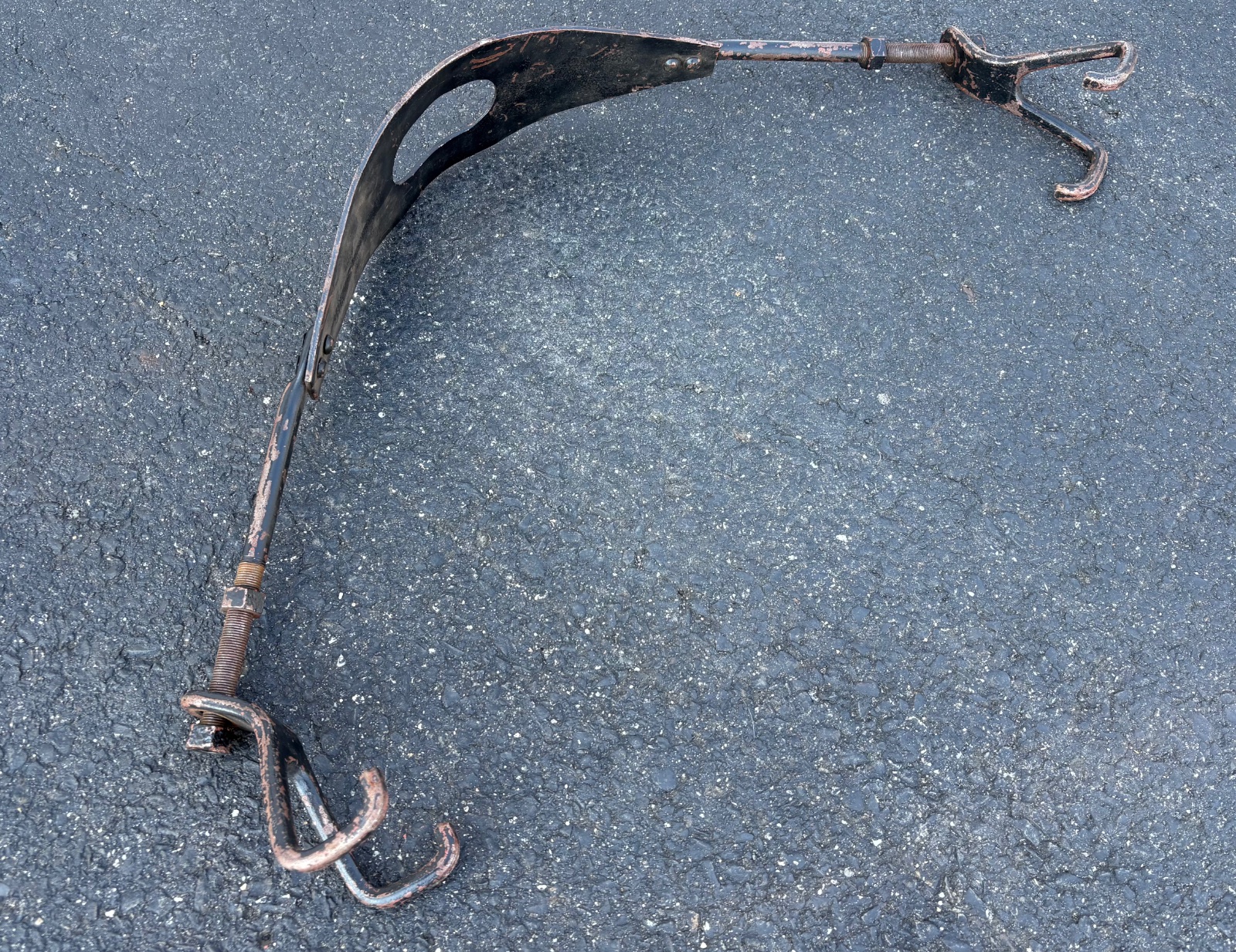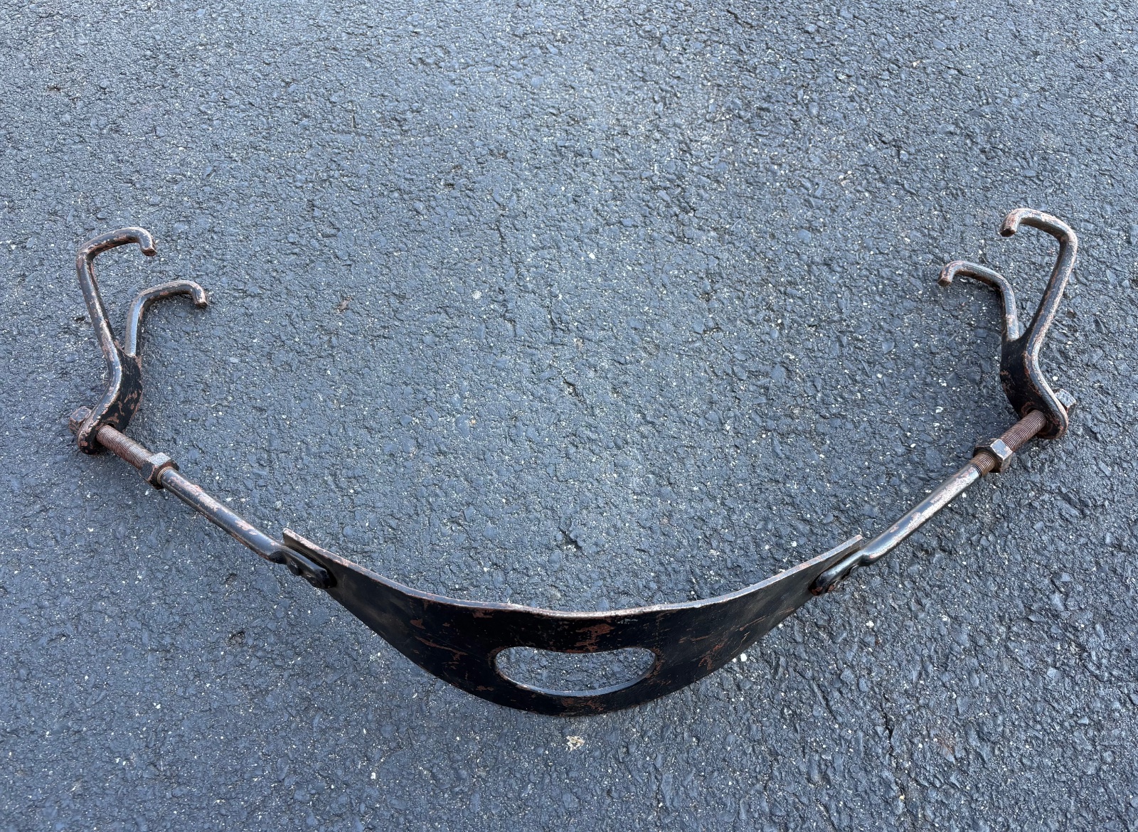 Very nice period accessory engine oil pan brace. Also known as a “belly band”. Works great to take some load off of your pan ears. Has very nice hooks that attach to the frame rails on both sides.