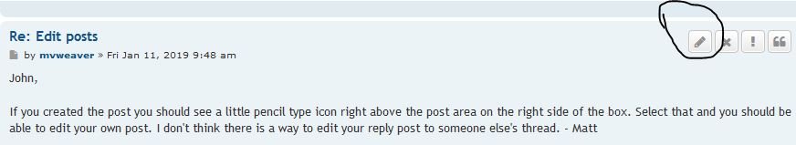 If you created the post you should see a little pencil type icon right above the post area on the right side of the box. Select that and you should be able to edit your own post. I don't think there is a way to edit your reply post to someone else's thread. - Matt
