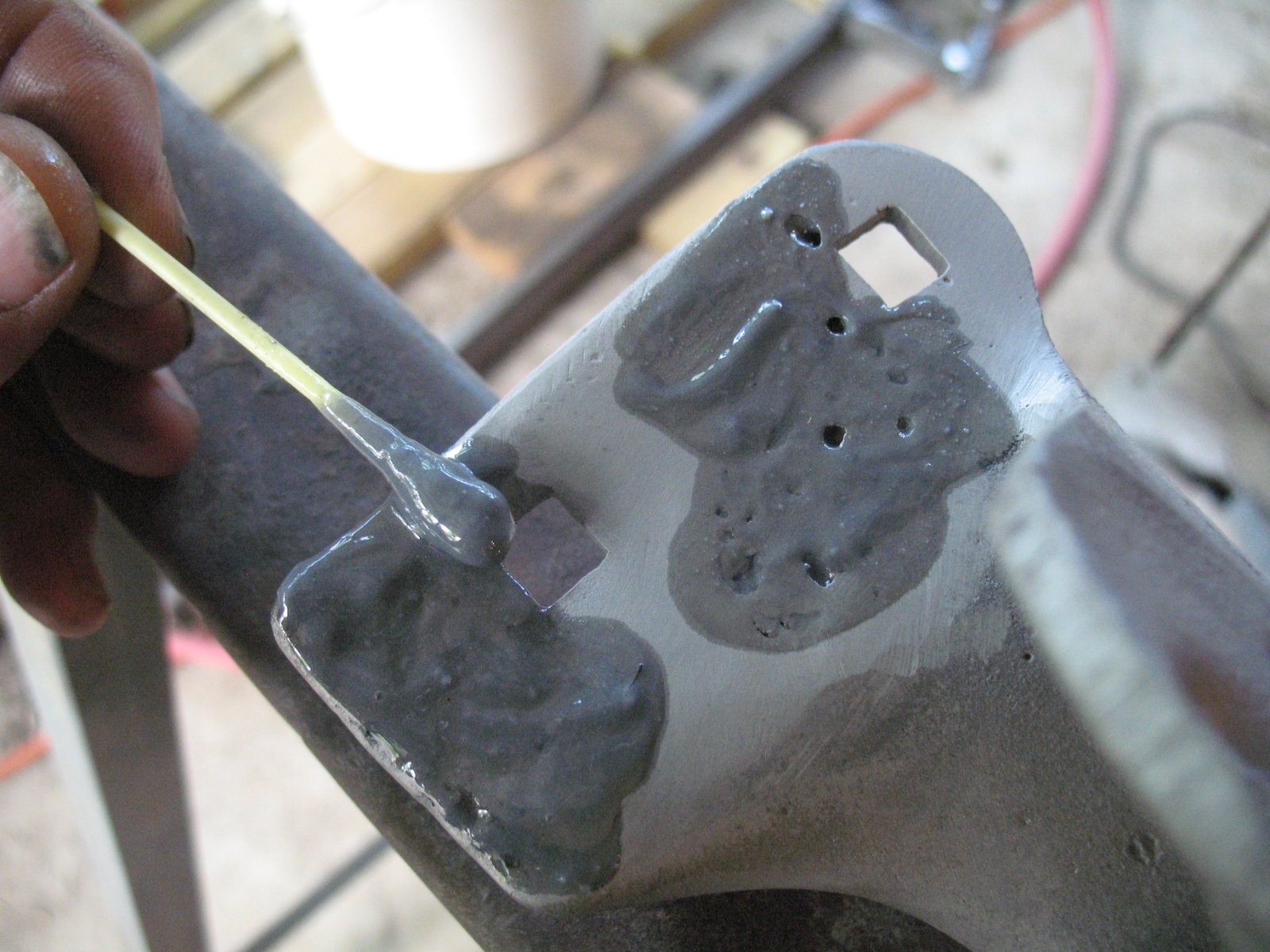 Earlier I repaired these rounded-out carriage bolt holes, and today's job was to fill the little craters around them.