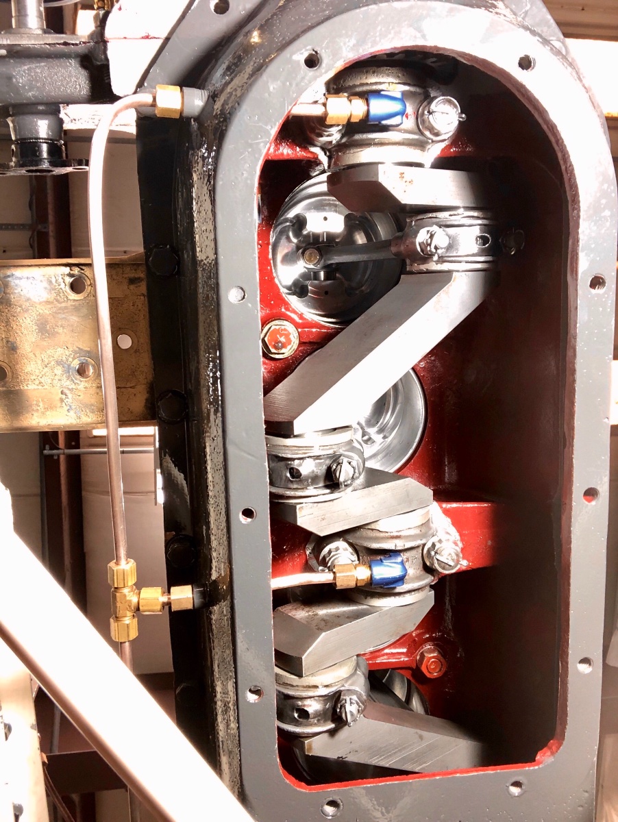 I think I overheated the motor last summer, and there was scoring on the pistons and cylinder walls. Fortunately we were able to hone the cylinders, but needed new pistons. When Tony got into the motor, the crankshaft also didn’t turn well (videos below) and was binding. The shaft was straight and the bearings were fitted, but evidently not in line. He did a little sanding and brought everything into line.