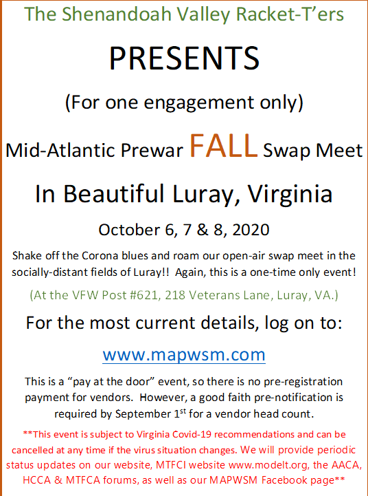 So, on a cautious, but enthusiastic note, the Shenandoah Valley Racket “T’ers” would like to cordially invite you (for one engagement only) to our Mid-Atlantic Prewar FALL Swap Meet in beautiful Luray, Virginia. The event will take place at the VFW Post #621, located at 218 Veterans Lane, Luray, VA.