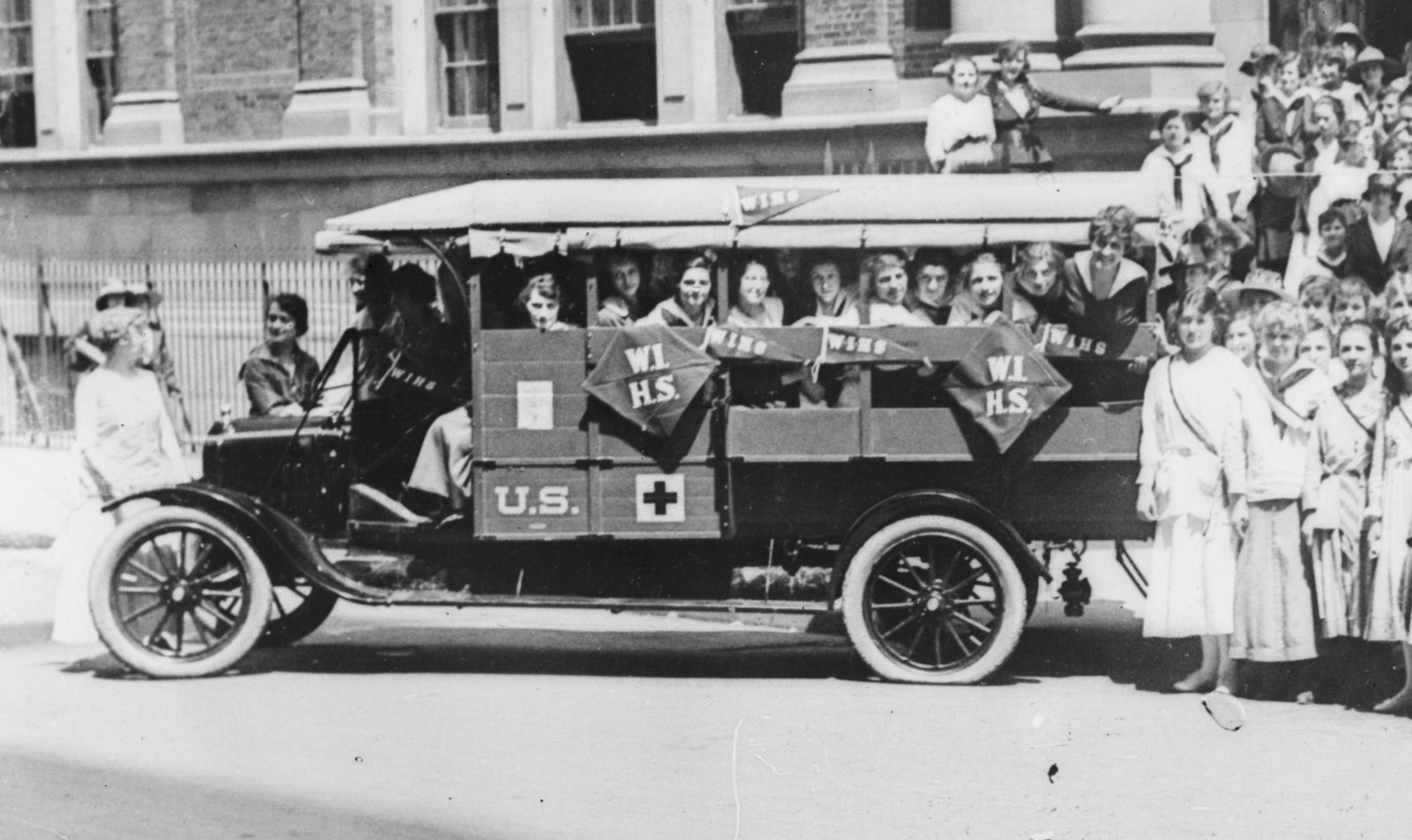 Brooklyn YMCA boys organize hospital unit for work in France. Reviving a "victim" with a pulmotor; Washington Irving High School girls present war ambulance to the Red Cross