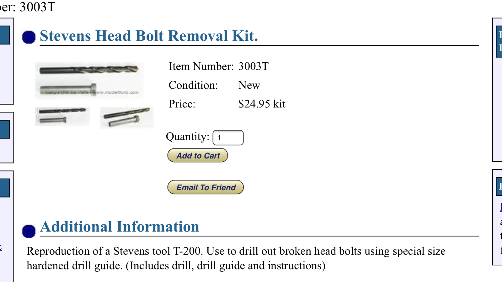 Had that happen to me. Bolt broke at the block, top half stuck in the head, bottom half stuck in the block, bolt sheared flush with top of block. Head was the easy part, heated it up, applied candle wax, and the broken bolt poped out with one gentle tap. The bolt frozen in the block was the real problem, no protruding stub to weld to... Well I found a Stevens T-200 drill bushing and drill bit and using the head as a jig, inserted the bushing and drilled it out with a special size drill. All that was left was a little coil of metal on the threads which came out by chasing the threads with a regular tap. I liked it so much I reproduced it and it is available through Langs and Snyders. Also have a different size for Model A available through Snyders.