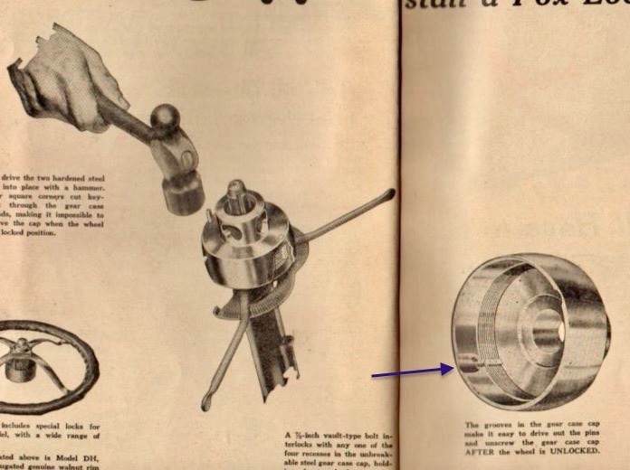 Anyone know how to get the base of the Fox locking steering wheel off? I need to get to the gear set to replace them. I read in a November 2011 post that you drive the pins out from the bottom, however, I don't see holes in the bottom of the case. Even if there was, they would be behind the throttle and spark advance levers. This is on a 26 coupe. Any ideas?