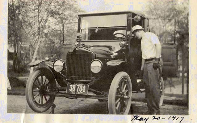 Wow! Second photo. In front of the garage is parked a '15/'16 runabout. However, of much greater interest, is the early 1917 Coupelet with the top folded down! A model made for only a few months, and in very low numbers. Even photos of the cars are rare.