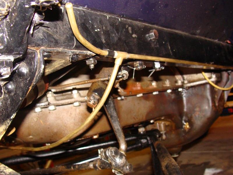 Here are some pictures of my unrestored 13 Touring showing the gas line for the headlights running under the wood block at the rear engine mount.