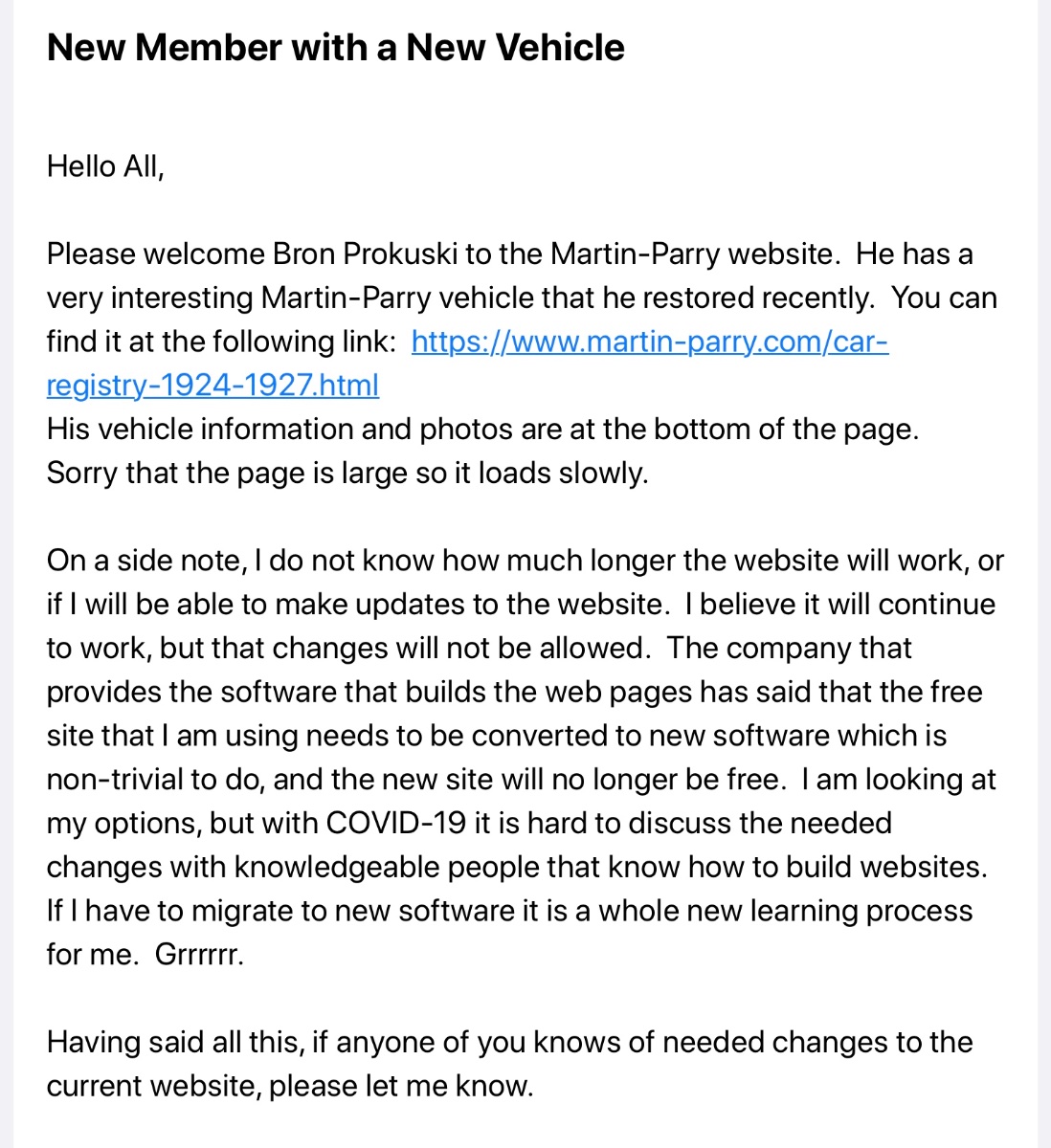 Ben Purkey retired as a school teacher in the PNW , and spends his time between Mexico and the PNW . About the time he started restoring a very rare early model A station wagon with a Martin-Parry aftermarket body, he started assembling this amazing website. I think about 10 years ago . Sorry I don’t really know how to post a link, but instead I am posting a screen grab. This amazing link shows just a sliver of what info Ben has accumulated and freely shared. Ben is afraid now the website is reaching its limits, and would be a real shame to lose it.