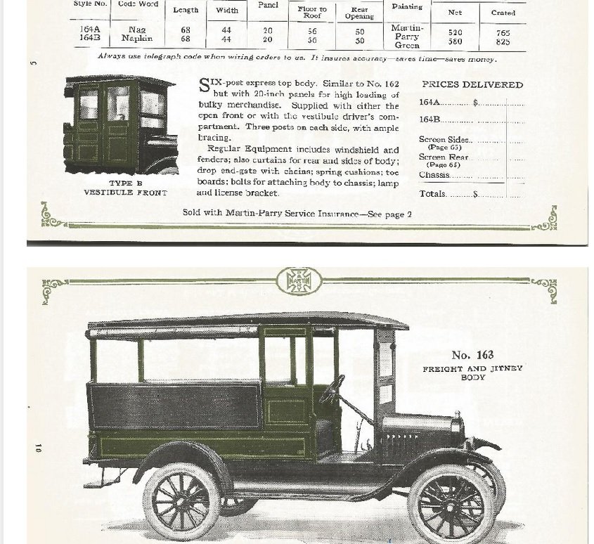 His info saved and posted is by vast majority model T ford related. The company also made bodies for other vehicles.The car Ben restored, the 1928 ford station wagon is right at the end of production, when the M-P company was then bought by General Motors, and renamed the Chevrolet Body Division. Ben’s beautiful 1928 wagon is one of 3 or 4 know survivors, and likely Ford , although having provided the vast majority of the auto platforms for most of the years of M-P offerings, dealt the death blow when they came out with their own wood bodied vehicle in December 1928, the Model A station wagon. These were the first complete factory offerings of a wood bodied vehicle. I hope you can take a minute and check out this site. Another way in is just to google Martin-Parry.com