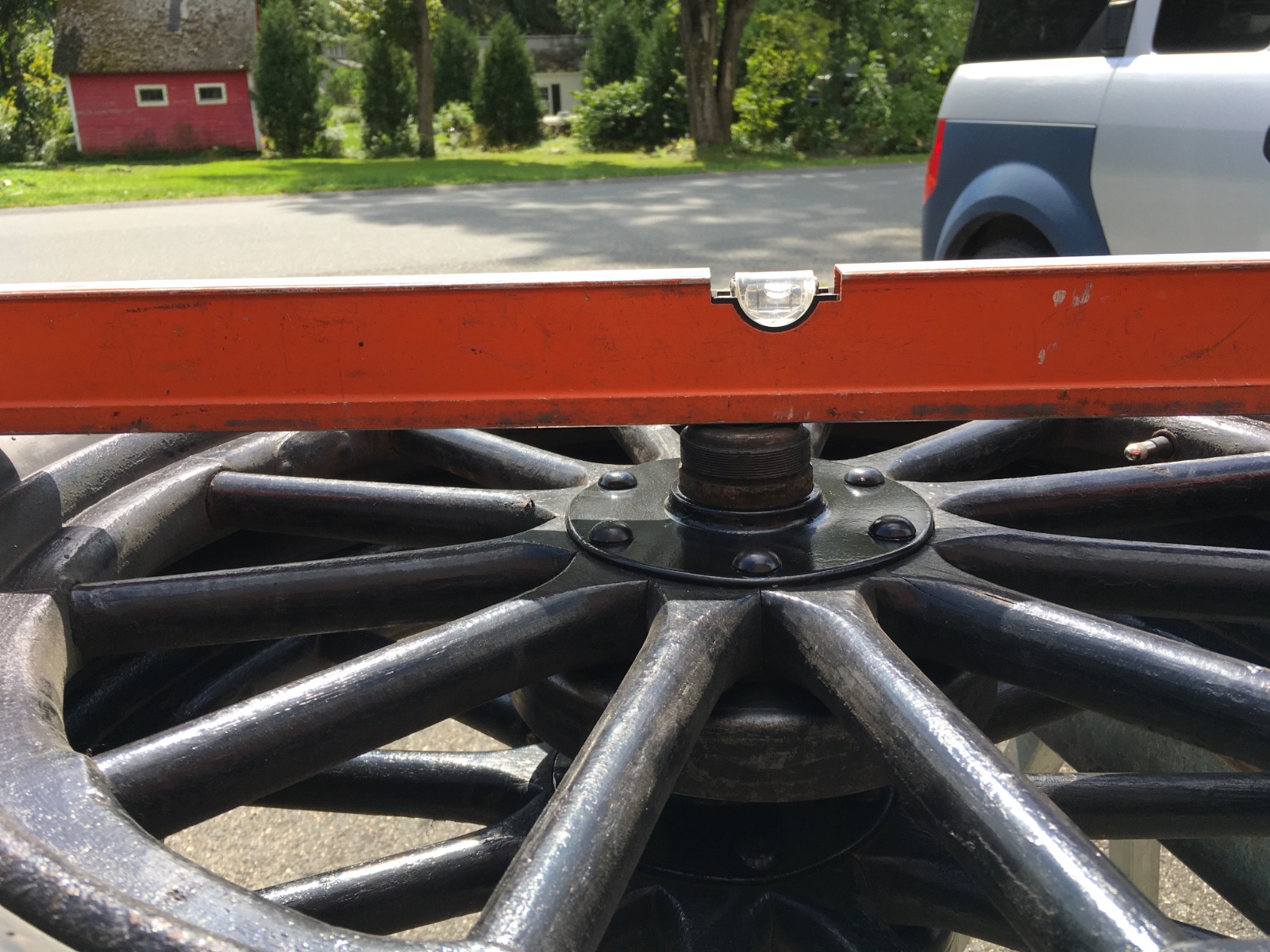 I have posted in the past how to true-up a wood felloe wheel via the Dyke's manual method based on my own experience.