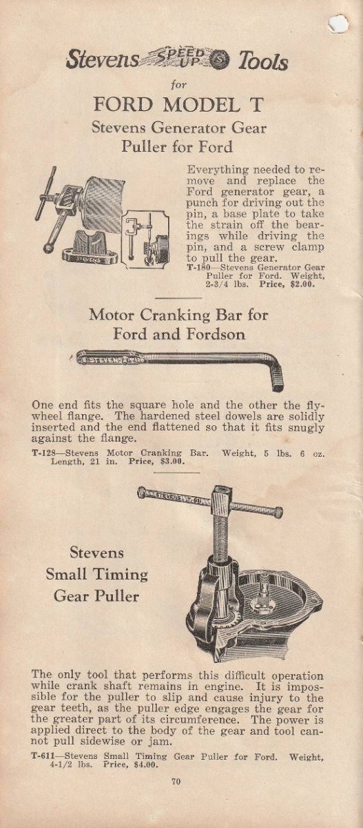 I finally acquired another Stevens catalog. They are very hard to find, and even harder to find one that is for sale. . It is what most folks consider the 1928 version. Stevens was bought out by Walden Worcester in late 1926. This is the catalog they put out after the buy out. It has most all the Stevens tools that were in the earlier catalog I re-printed several months ago,, and several tools that are in no other catalog that I know of. Most of them I have never seen in print before. I will post a few pic of some of the different tools. But I can not show all of them here. This catalog also has the Walden Worcester line of tools. Walden tools were not near the useable quality of the Stevens tools. Walden really stepped up their game when they acquired Stevens. Even though the Walden tools are not really as useful to us today, they are very collectable. This catalog will show what each Walden tool number is used for. There is also a small section of tools for the new Model A that just came out. There are a few pages of tools for Dodge, Chevy, Buick ect. It appears that Walden/Stevens was trying to widen their market in 1928. There is not much of the "other makes" tools. Most of the catalog will apply to our Model Ts. A lot of the Walden tools were considered to be useable on most all cars and trucks, so they are shown as "standard" tools even though they are some of the the same tools shown in the Model T section. This catalog is a very good reference for taking to a swap meet. The catalog is about 4 by 8-1/2 inch and has 96 pages not counting the covers.