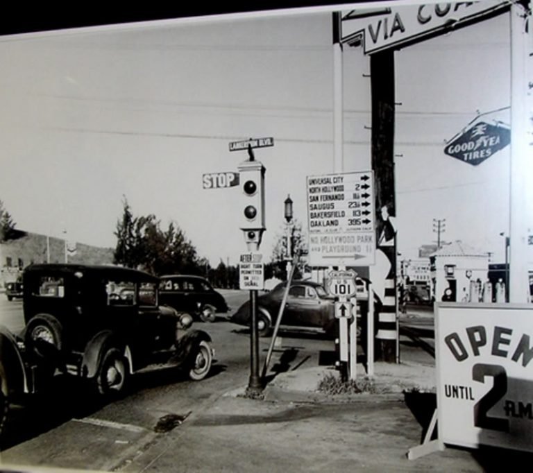 From the signs and cars I'm guessing this is looking northwest on Ventura Boulevard at Lankershim about 1940. Wikipedia claims these were retired around 1930, but I distinctly remember them after the war.