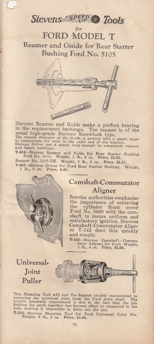 I finally acquired another Stevens catalog. They are very hard to find, and even harder to find one that is for sale. . It is what most folks consider the 1928 version. Stevens was bought out by Walden Worcester in late 1926. This is the catalog they put out after the buy out. It has most all the Stevens tools that were in the earlier catalog I re-printed several months ago,, and several tools that are in no other catalog that I know of. Most of them I have never seen in print before. I will post a few pic of some of the different tools. But I can not show all of them here. This catalog also has the Walden Worcester line of tools. Walden tools were not near the useable quality of the Stevens tools. Walden really stepped up their game when they acquired Stevens. Even though the Walden tools are not really as useful to us today, they are very collectable. This catalog will show what each Walden tool number is used for. There is also a small section of tools for the new Model A that just came out. There are a few pages of tools for Dodge, Chevy, Buick ect. It appears that Walden/Stevens was trying to widen their market in 1928. There is not much of the "other makes" tools. Most of the catalog will apply to our Model Ts. A lot of the Walden tools were considered to be useable on most all cars and trucks, so they are shown as "standard" tools even though they are some of the the same tools shown in the Model T section. This catalog is a very good reference for taking to a swap meet. The catalog is about 4 by 8-1/2 inch and has 96 pages not counting the covers.