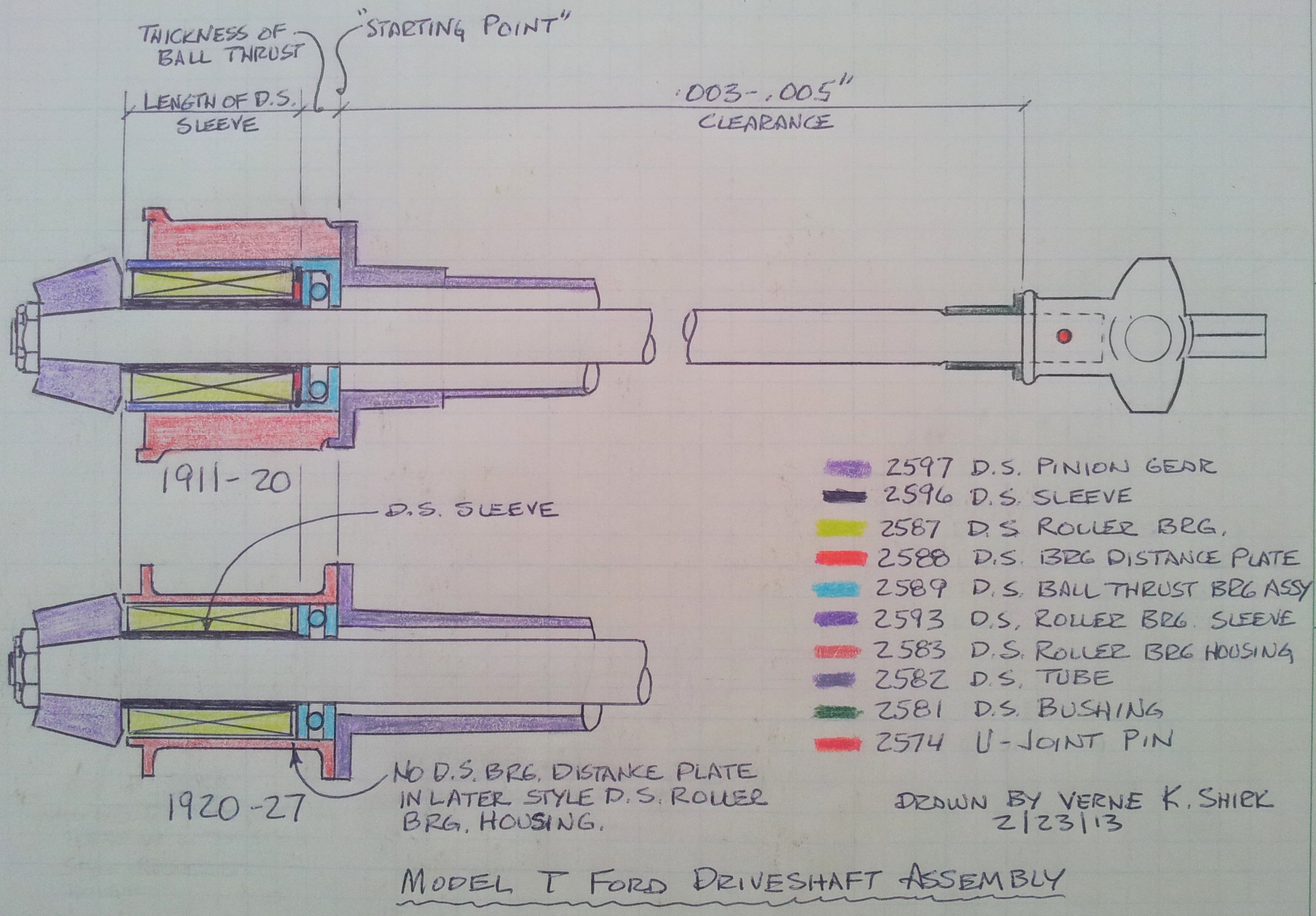 Thank you for taking the time to create these detailed drawings. The area of the driveshaft seems to be one least understood assemblies. Here is my take on it. Starting with the pinion gear and driveshaft. The pinion gear will only go on so far due to the taper. The inner sleeve should come up tight against the back of the pinion gear. The ball bearing thrust should bear against the inner sleeve. The ball bearing thrust should be held from going forward by the back end of the driveshaft housing. With all of that said, the driveshaft parts as described will not go forward, towards the engine.