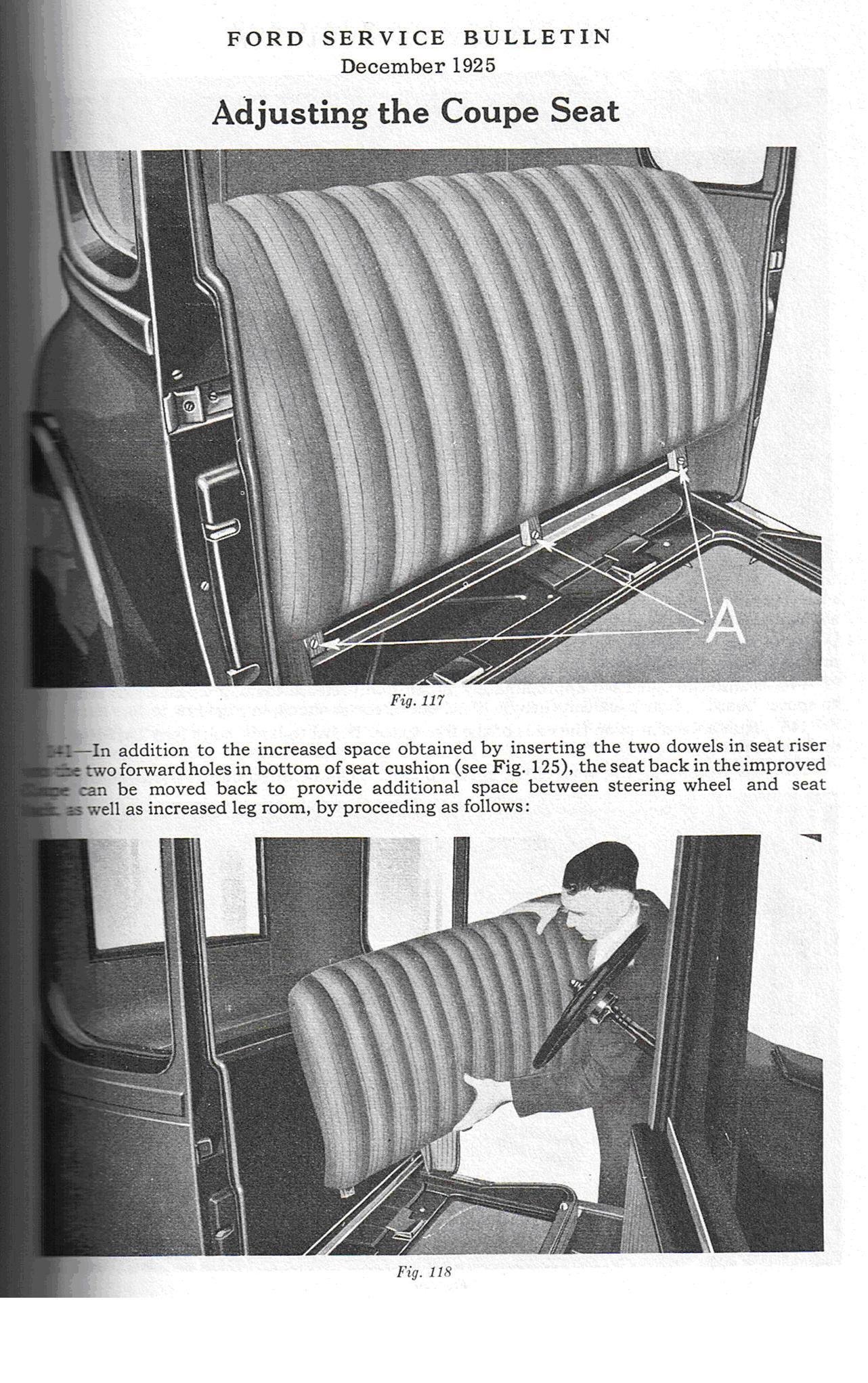 This may be posted too late to help you, but perhaps it will be of help to someone else with a 1926-27 coupe in the future. I had tried posting this as a link to an earlier posting. But when I click on the link it gave a 401 error or something similar. Since I had it saved, I will repost it here. It all deals with moving the early 1926 and 1926-27 Coupe seat back.