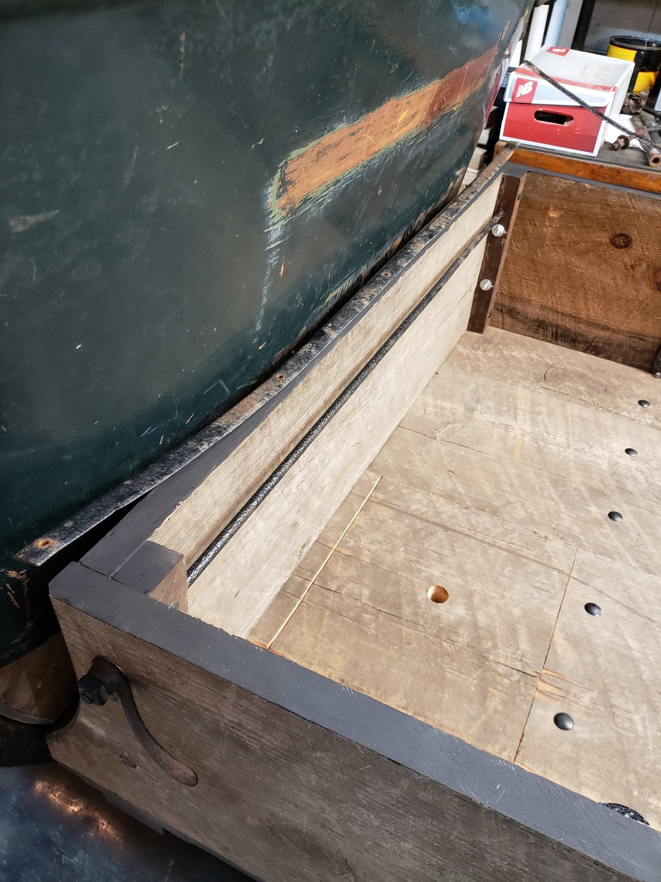 The bed is slightly longer than the typical slip on bed plans call for, but we liked these proportions better. Lots of mockups were completed before these final boards. The end result is a solid frame and bed! It'll work real good, and the weathered wood and hardware help it match the rest of the car. Extra attention is being given to distressing and grinding the heads of any new hardware so it looks older than it is. Not perfect, but we like the results. All we need to complete are some good 8 or 10 inch strap hinges with pintel's threaded like a bolt and some rear touring or roadster fenders that are solid and preferably match the patina of the car. (Please see my classified want add for more info on those)