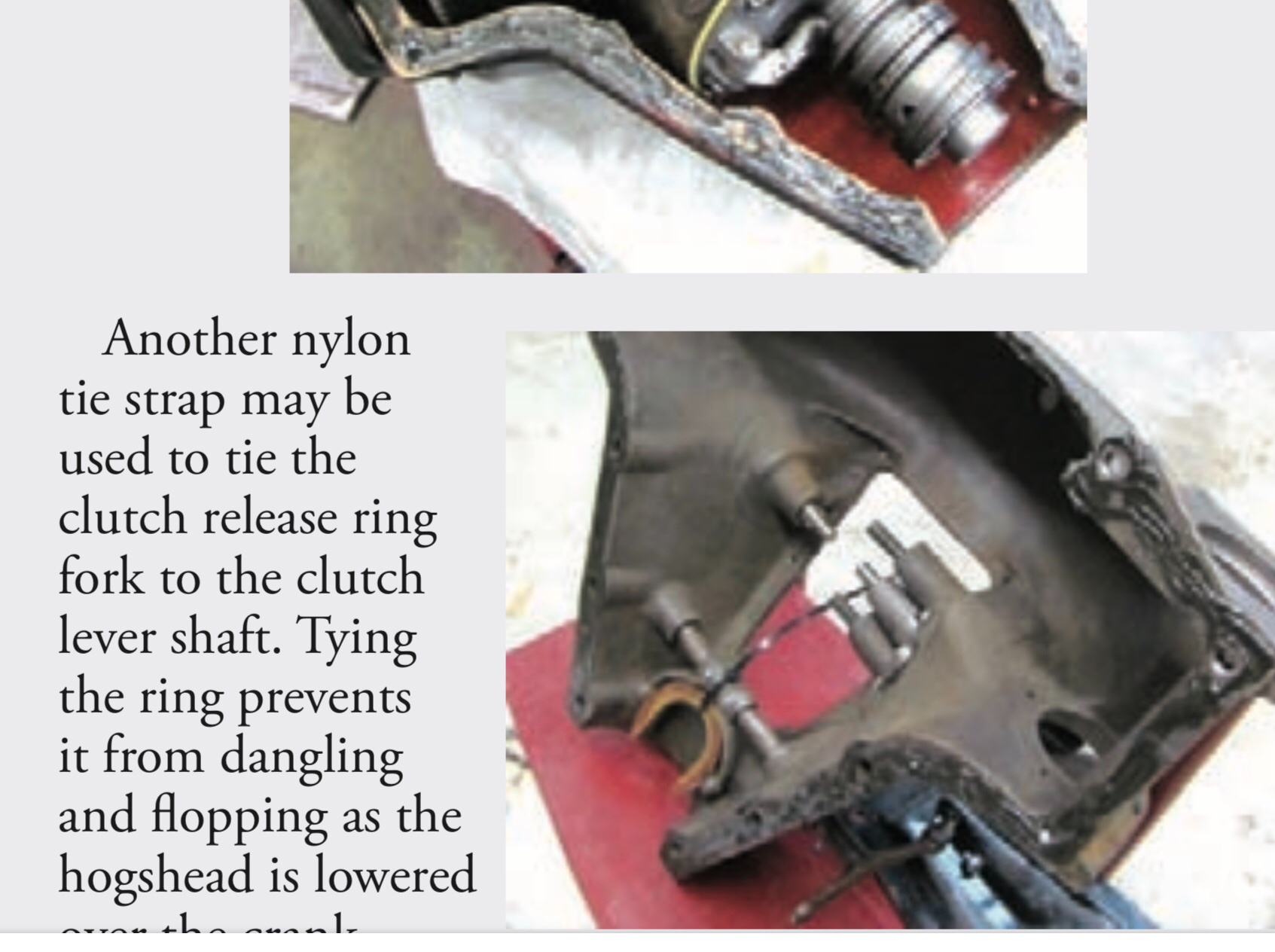 Large nylon wire ties, hold the band ears, and for me, the clutch fork is held by one too. Keeps the fork from wiggling, and you can direct it in place holding outboard on the clutch lever, one hand there, the other hand just inside the inspection port to lower the cast iron hogs head. IMO, Permatex #2 always works to seal, don’t like messy and sticky fast set RTV, time is necessary for the multiple steps needed to lower, align, fit band fasteners when doing this by yourself, even with practice it isn’t a fast install. Sticky, stringy RTV dries too fast for me. Plus those peeling off shards of dried RTV can find their way into the engine.