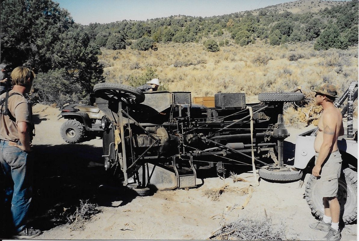 And here's my Oops! On a camping trip outside Minden Nevada I was teaching a 20 year old to drive the TT on a back road that turned out to be just a tad too sandy. The left front wheel caught some deep sand and a couple of fishtails later....No one hurt. Broke all the spokes in the right front wheel. We got it flipped back upright with a jeep and tow strap. I took out the hub bolts to remove the spoke stubs and we bolted the jeeps spare to the hub by lining up two holes. It looked ridiculous but it worked to get the truck back onto the trailer. Can't find that picture. No real permanent damage except the the cab is tweaked just a tad off center. I had to trim the floorboards a bit to get then to fit.