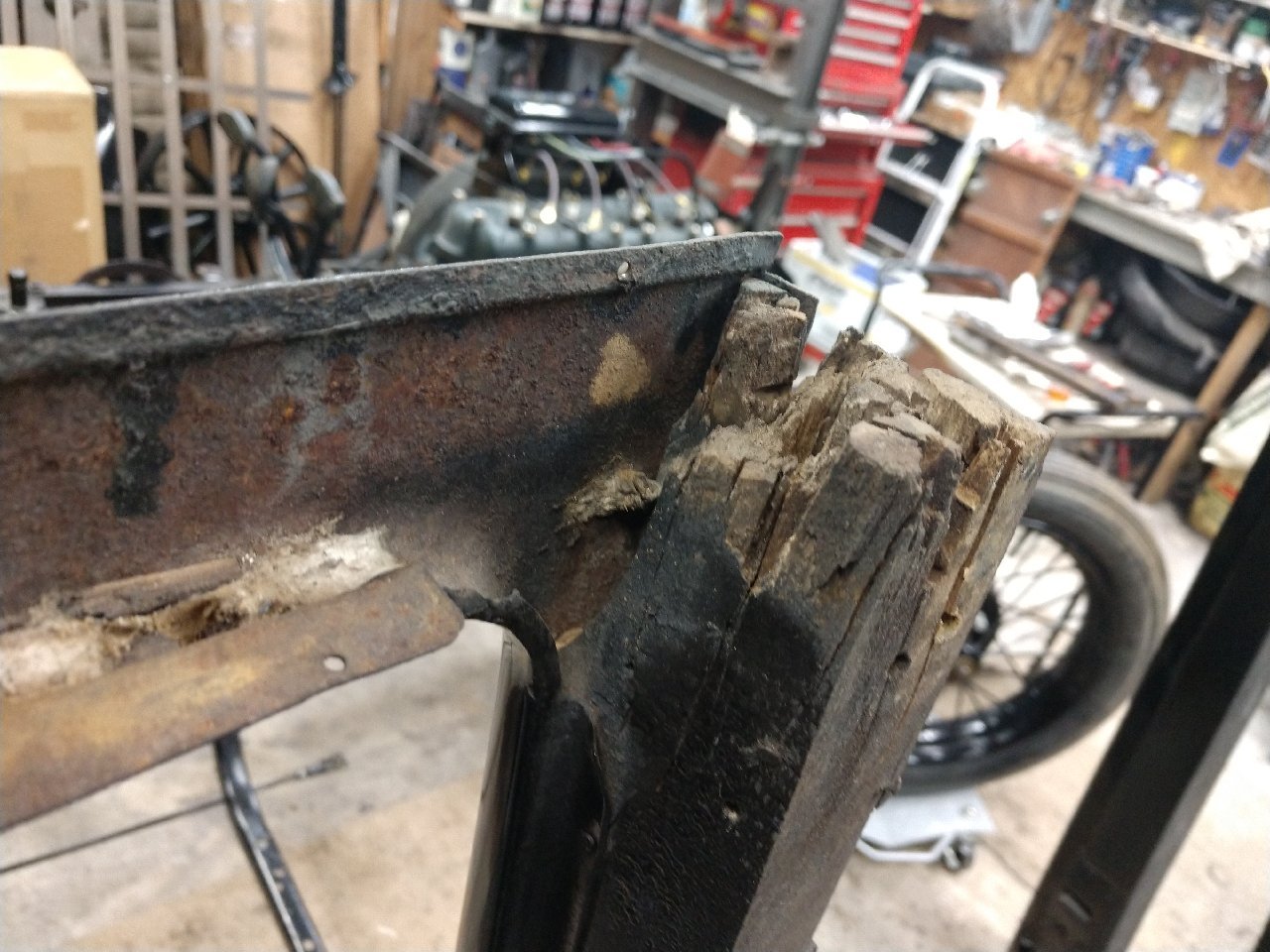 I've mentioned on prior posts about the main-rail crossmember tenon wear. Here is a perfect example of just that. The main-rail outer edge has settled more than a 1/4" on both sides of the car. This may seem minuscule but when the time comes for the final fitting and door operation it can make for a frustrating reward for a heck of alot of work.