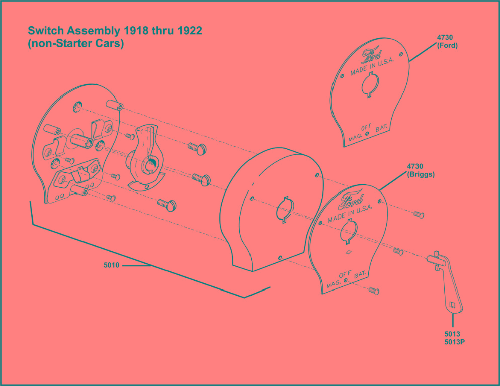 The internals of the switch send the electricity to the coil box. Inside the switch functions just like the coil box mounted switch, the headlight function is inside the switch but a separate part. The earlier cars 1919-21 still used the coil box mounted switch with a combination horn button/light switch on the steering column with the dimmer coil on the dash, later the dimmer was placed where the ammeter goes. I had a starter coilbox and temporarily ran a wire from my mag to a house light switch (no headlights) until I found a combo switch for the column and a coil box with a switch on the front.