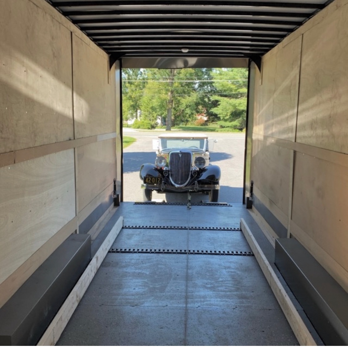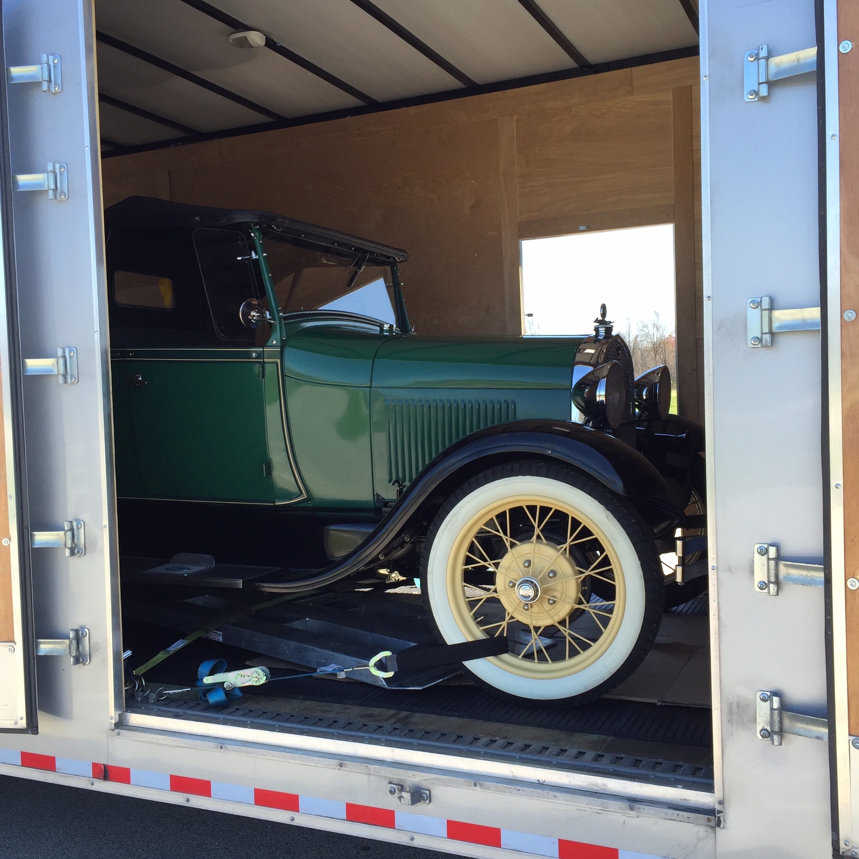 We have no problem securing the rear of the T to the rear of the trailer. We are looking for an easy way to secure the front without having to squeeze pass the right front fender into about 1ft of floor space. I don’t think an additional front door is in his future, although it would solve the problem, and I don’t want to rely on the winch to hold the car from moving backwards. A couple of saddles for the front wheels would work but would make it hard to unload. He plans on screwing 2X4s to the floor as guides for the wheels.