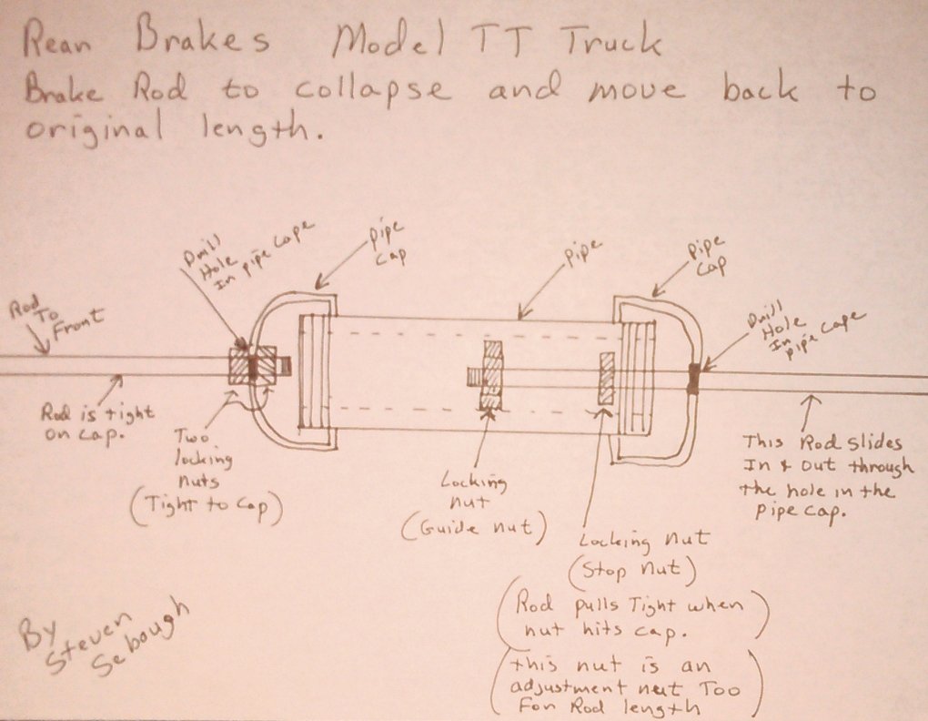The black Iron pipe is my design to make the brake rod collapsible when I apply the rear brakes while using my brake pedal (see the drawing for details on how to make them). Since I added a Muncie 3 speed overdrive gear box to the truck with a high-speed gear set (5to1) to the rear end, that increased my speed to 40 miles/hour and also added a true neutral to the drive train, I needed to increase my braking power and add brakes to the rear end. When I push the foot brake pedal, the rear brakes are applied as well as the transmission brake. I adjusted the rear brakes to be applied just before the transmission brake is applied. The truck stops much quicker, and increase my braking power by 3 times. I also wanted to keep my brake rods in their original position, so I added the cables to the equalizer system. I know I could have just moved the brake rods (if lengthen) to the equalizer but I still liked the look of the brake rods on the outside. Also having rods and cables gives me a backup braking connection. Since I added the cables to the equalizer system and left my brake rods on the hand brake system, I need the rods to collapse on themselves when I push in my brake pedal in. So, the black pipe system on the brake rods makes this all possible for this to work VERY IMPORTANT THE ROD NEED TO BE ALIGNED SO ALL THE PARTS WORK SMOOTHLY. Here are a few pictures of the braking system.