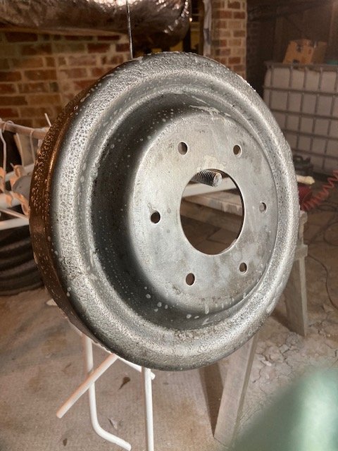 Wheel paint has been stripped with 3 treatments of Citrus-Strip and lots of wire brushing. The wheels are hung up ready to paint. Treated the residual rust that was resistant to wire brush with phosphoric acid metal prep. Painting will commence soon.