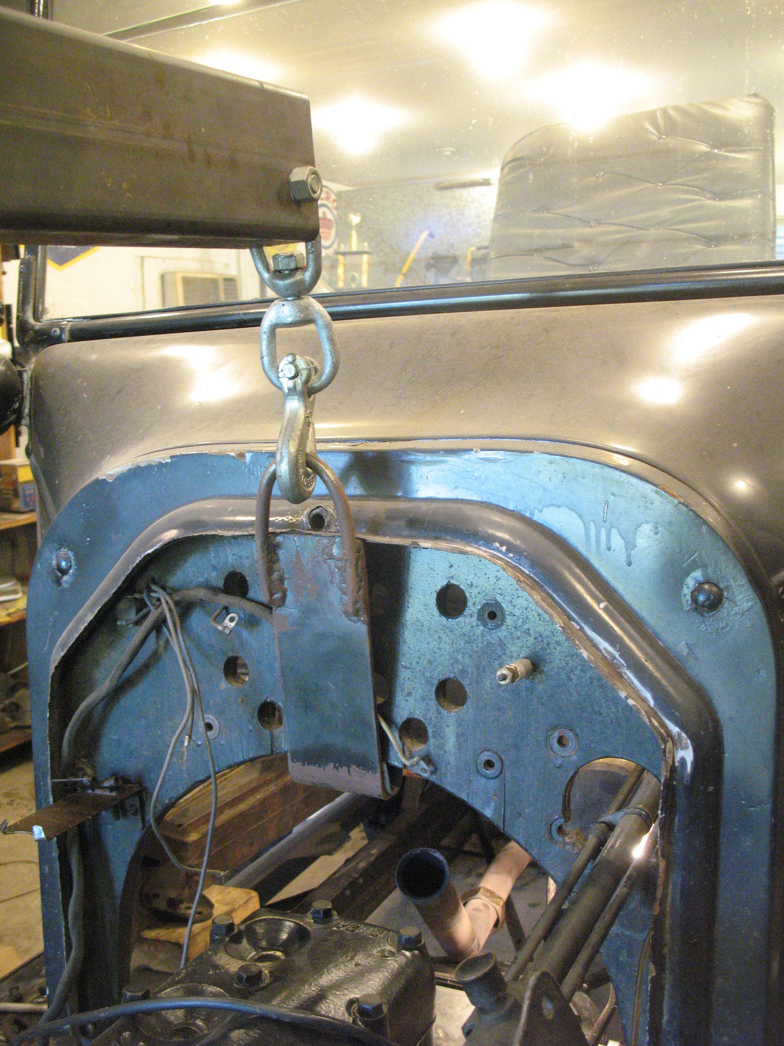 Steve, that is a fantastic body lifter that you made. It may not be a bad idea to put a rag or something on the wood firewall before lifting to keep that 100 year old wood from shattering. I always removed the firewall on my 18 when I removed the motor but I was not concerned with damaging paint of the hoodformer bolts. Frank