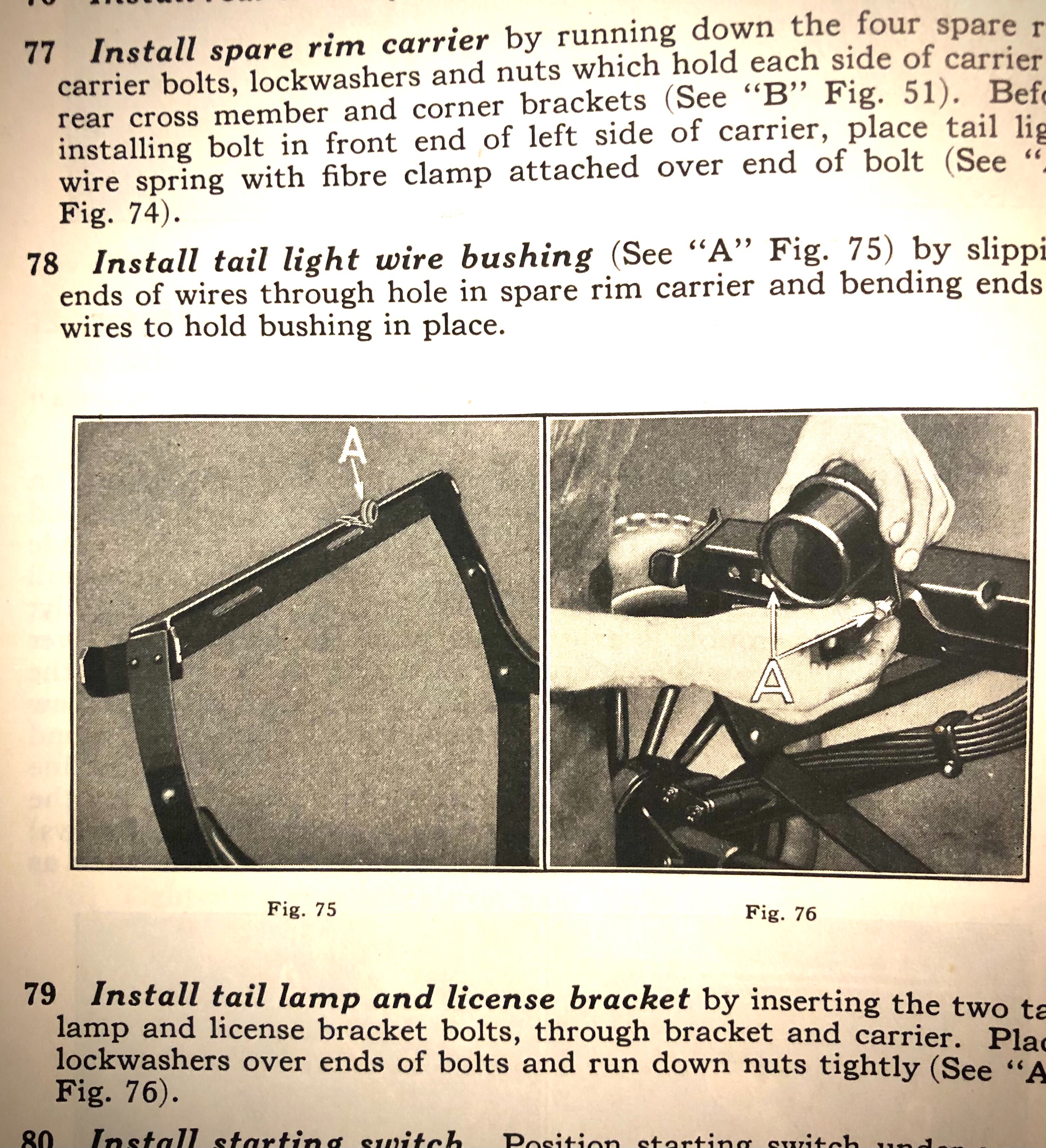 Tail lamp assembly with license plate holder on 1924 and 1925 , mounted on spare carrier, then on 1926 and 1927 with added fender mount bracket.