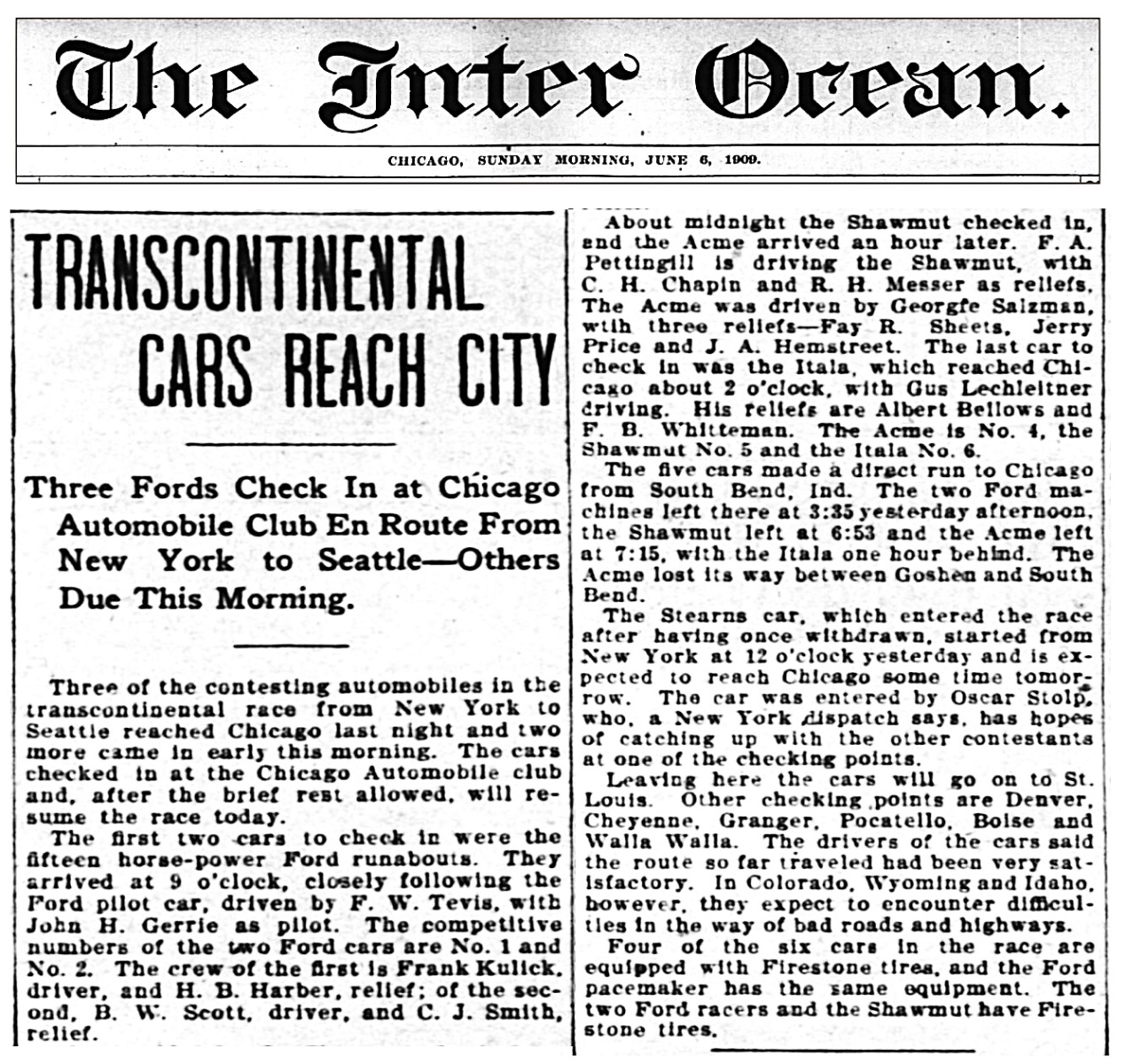 This account mentions that the K pilot car was in the lead as the racers entered Chicago. At the end, it mentions that four of the six race participants are using Firestone tires. The K pilot is included in this tally. It also mentions that the Stearns car has left New York as a participant. However, the Stearns car and crew never become a factor, and I don't think they made it out of New York state.