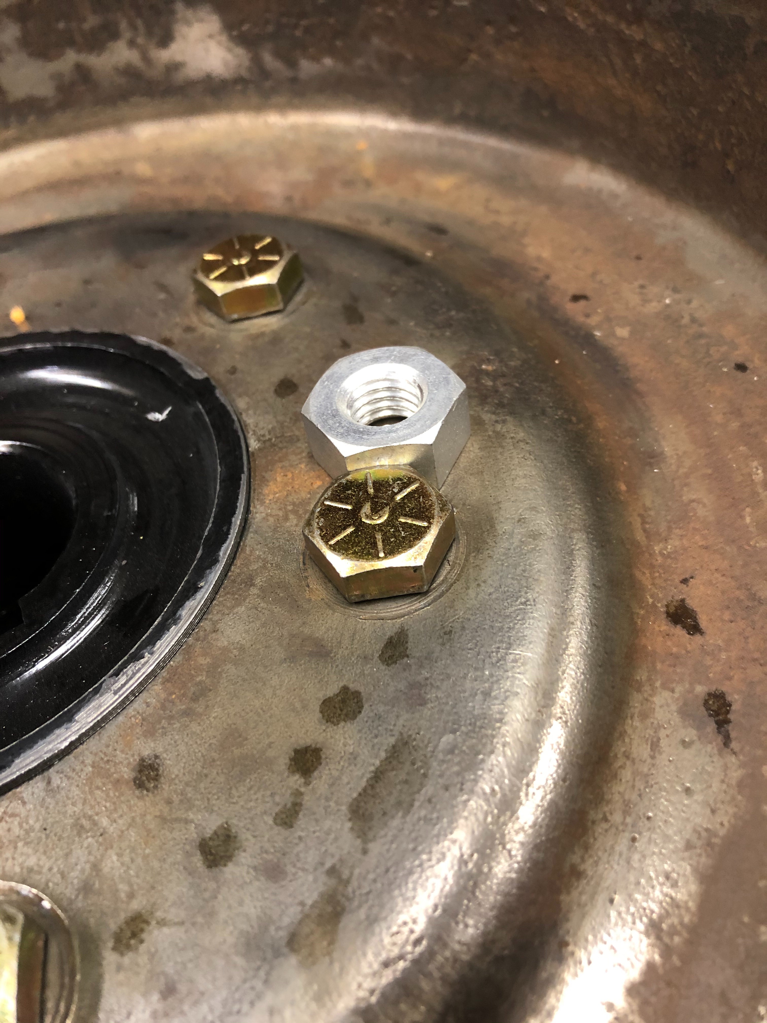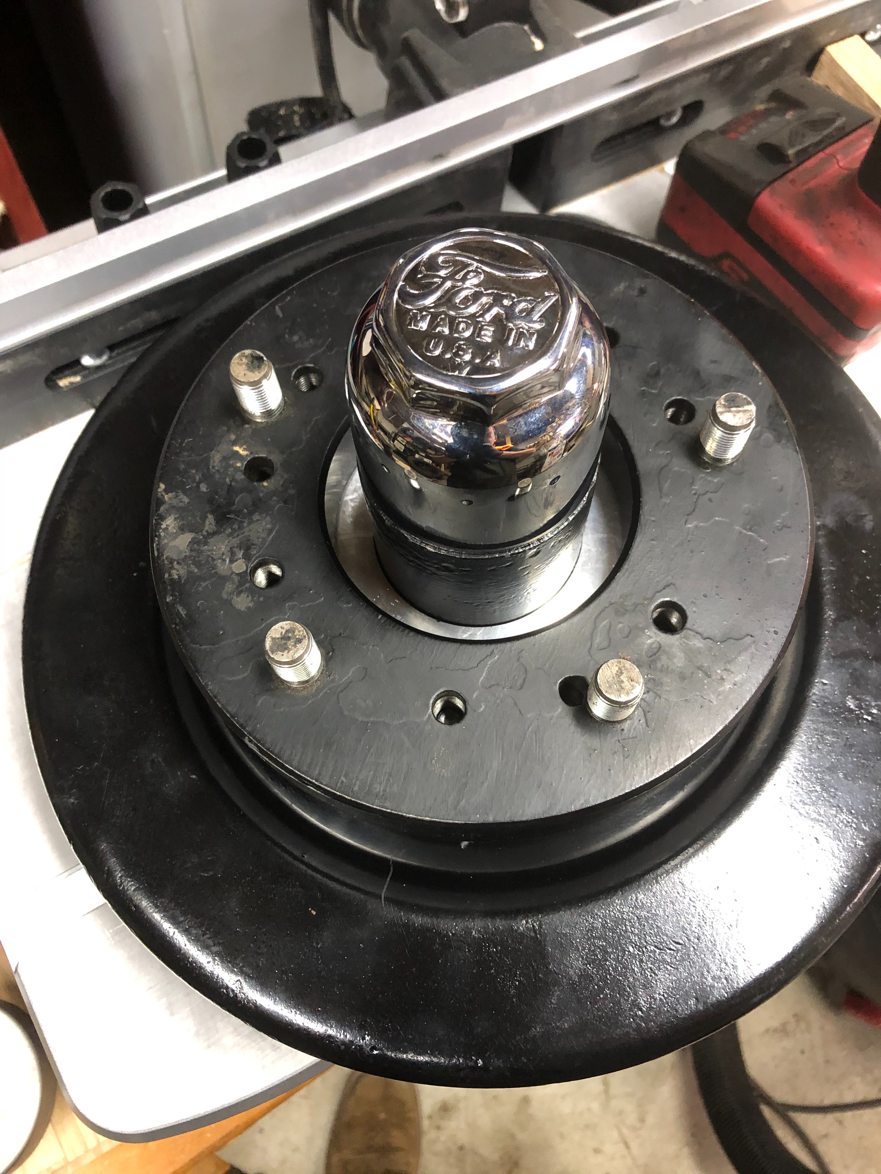 I think I’ve solve my problem that is a terrible supply of 20” TT wheel parts. When I got my 27 TT the rear wheels were in terrible shape. Namely the rims. I’m pretty sure you could read the news paper through most of the rust holes. So I thought I’d just get a better set. Now I’m positive that rims in good shape are made of unobtanium. I found a very nice set of Model A 19” wire wheels at a steal on an unrelated parts trip and then the gears started turning. I know adapters were already available for T wood hub to A wire wheel but nothing for the TT so with that information I set off on my own personal project. What it now boils down to is, with the help of my buddys machine shop, I have successfully adapted Model A wire to the TT rear hub. The A wires are a stronger wheel and 19” tires are way cheaper than their 20” counterparts. I can still get big 19” truck tires to fit the wheels but the tires that were on the wheels are very nice Firestone white walls so they’ll do for a while until I want to buy bigger tires for the rear to match. I’ve also made the plate thick enough to push the hub far enough away from the wheel to run disc brakes without interference or sacrificing structural integrity or safety. Once I’m done with the mock-up it’ll all go back together with loctite and lock washers to ensure nothing tries to come apart.