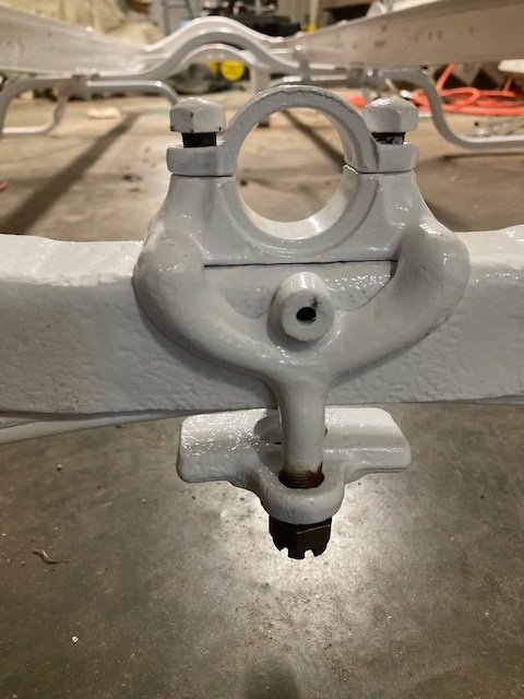 The one on the right painted black does not have a hole. On second measurement the one on the right painted black is only slightly shorter bolt than the one on the left painted white. You can see in the picture the two mounts superimposed, placed face to face, the black painted mount bolt is only slightly shorter than the white painted mount. The frame is a 1926-27. The plan is to have a hybrid 1926-27 frame with a 1916 theme top part Speedster. All sentimental reasons, no other real rhyme or reason to it. It will have a 1916 ish brass radiator eventually. For stance and my understanding of these the front spring pack I loaded with 7 leaves. They are all painted and look really great now I would be reluctant to break apart the spring packs at this time. A new rubber spacer is in place between the front cross member and the spring pack.