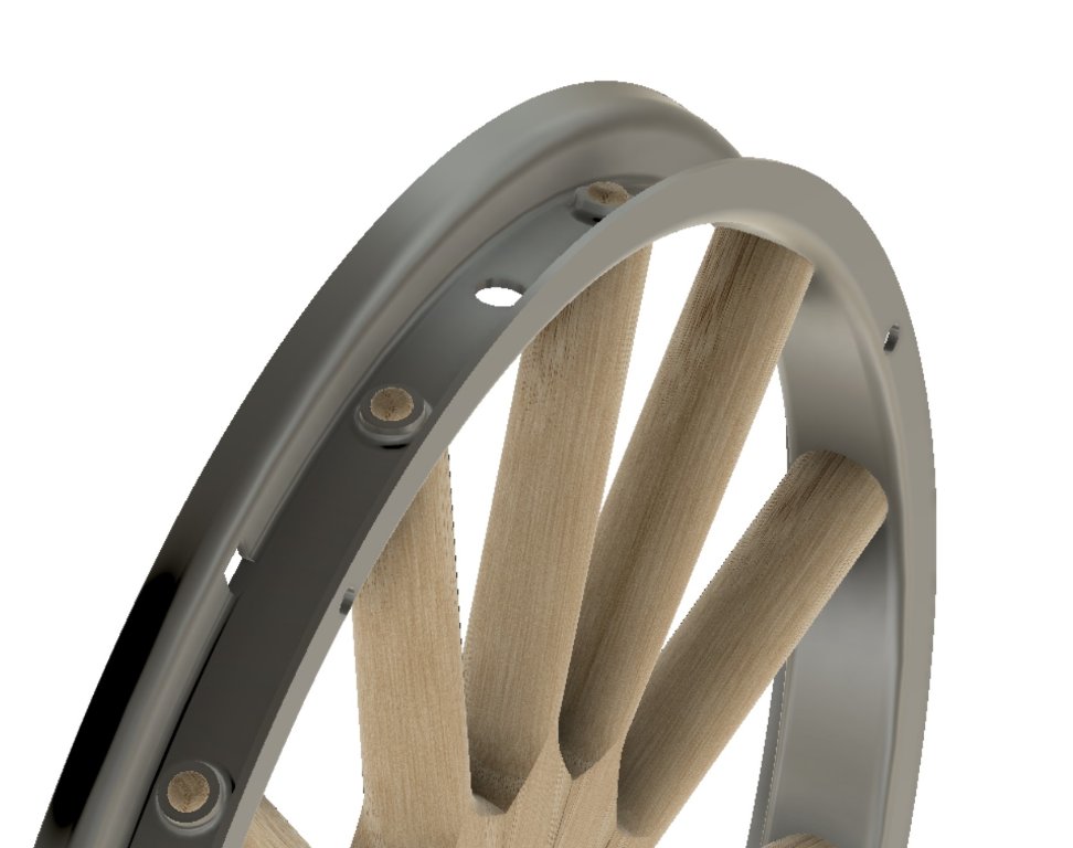 Till then I will share some screen shots of the 3D models I am building CAD. I have modeled the Ford felloe and spokes for the 30" wheels. Next will be the hub, then the rims. Then I will be able to cross section the model and share what I think is an issue with using Hayes rims on Ford felloes.