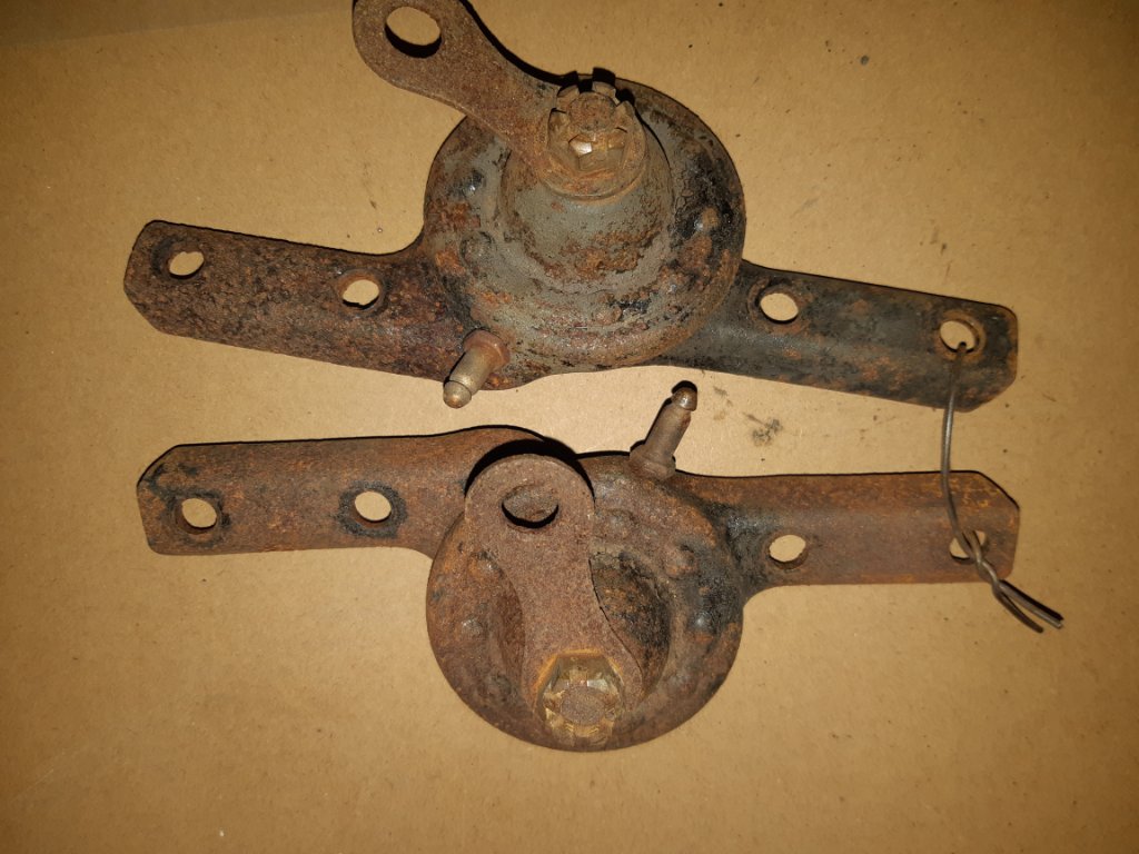 I don't offhand have any really good photos of the hinges themselves. As proper assembled units, they are easy to tell apart. The later offset/uneven fold style have one short and one long arm each side. The even fold, all the arms are short both sides. While some of the smaller pieces, springs, bolts etc, are the same or at least close enough to swap from one type to another, the four main pieces are each unique. There is a right upper, and a right lower, a left upper, and a left lower. All different and not interchangeable, at least not without major modification.