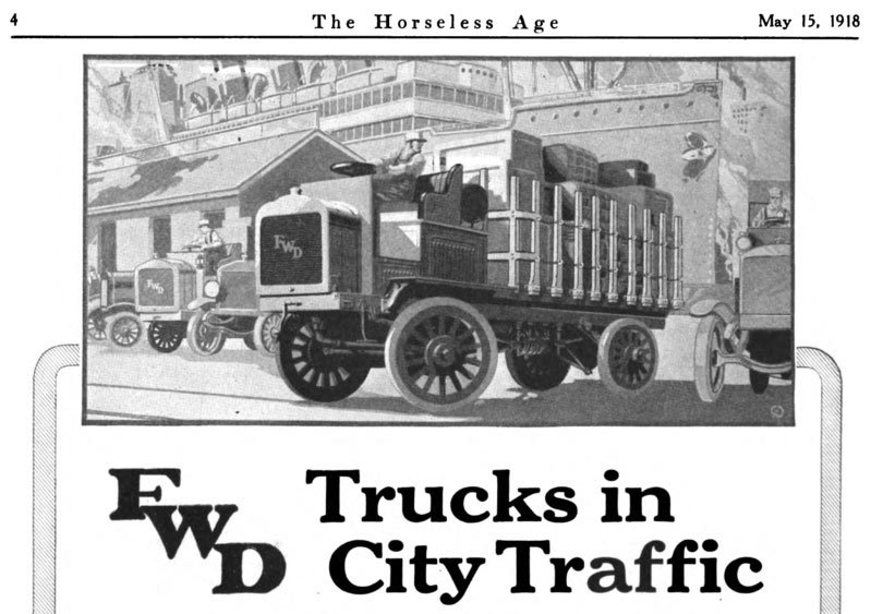 "The Four Wheel Drive Auto Company, more often known as Four Wheel Drive (FWD)". The license plate is most likely a 1918.