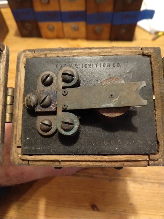 Does anybody have an idea what this coil is from? It's a KW Ignition Co unit about 3 inches taller than a standard Model T coil with a slanted hinged cover. Thanks,