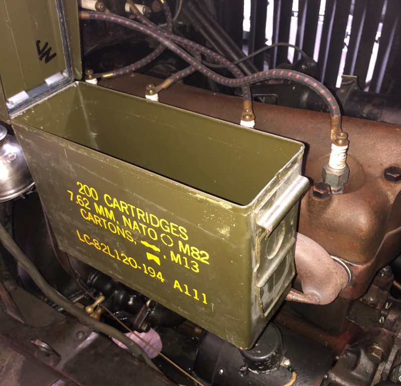 Add some metal L shaped straps to hang behind the manifold , with bolts or pop rivets to the backside of the can. You could even dimple the lower end of the ammo can at each manifold stud nut so the ammo can is right against the hot manifold .