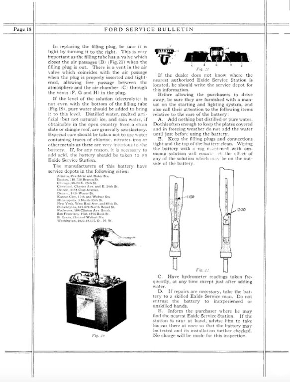 First (Exide) battery in a 1919 Ford Service Bulletin