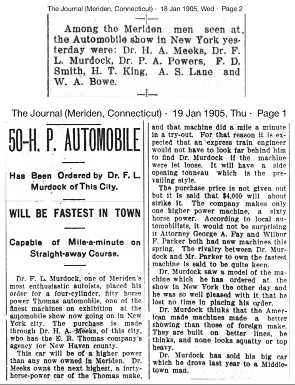 In January, 1906, Dr. Murdock joins other Meridan's at the New York Auto Show. It shouldn't be a surprise by now, but he's sold his six month Thomas: