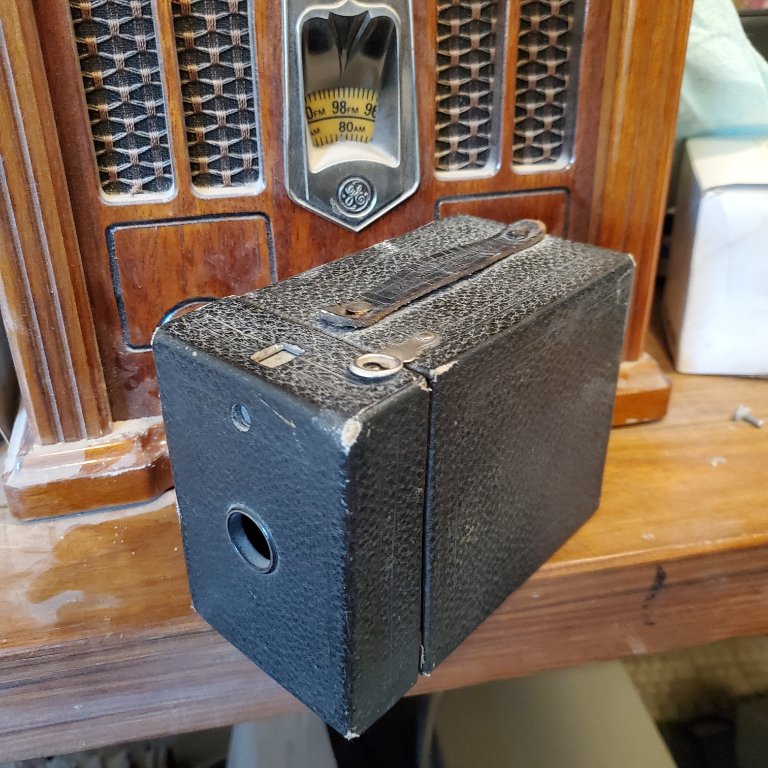 If John's camera is a 120 it's still usable. Other film sizes (116, 122, 124, etc.) are long gone. It has only a vertical viewfinder. Many box cameras, like the #2 Brownie, have another viewfinder for horizontal shots. #2 even has some limited aperture adjustment and a time exposure setting.