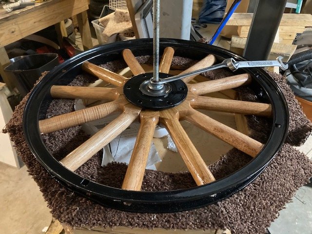 I just finished my 2 rear wheels last week and used a hammer and a putty knife on the few spokes that were sticking up a bit. That settled them into place and didn't marr the finish. Keeping the lacquer off of the inside mating surfaces is key. I also had misalignment of the holes at first and I just turned the whole assembly over, blocked it with 2x4's and pressed it apart and started over. Easy.ivaldes1 wrote: ↑Fri Feb 26, 2021 4:29 pmFinished with one sort-of. I have some slight misalignments of the spokes. I will use wax on the adjacent faces next time so they slide. Are the gaps shown especially in the last photo not acceptable? I may be able to improve on them with more tightening. Unfortunately my arbor press is just slightly too small to put the whole wheel in and press the spokes like one of the video shows.