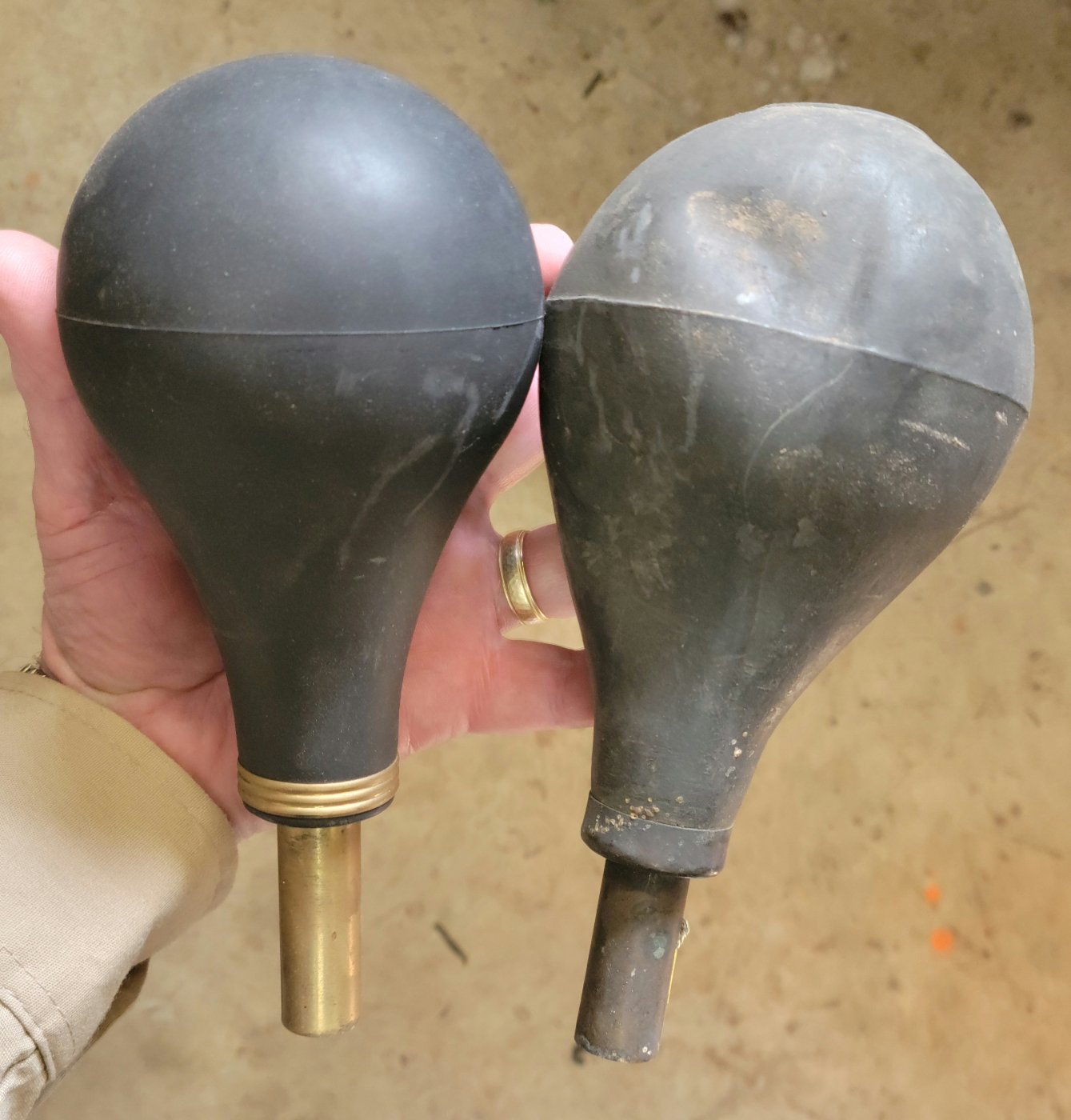 THE STORY OF THE HORN BULBS: When the original $3700 run of bulbs proved unusable due to the maker using the wrong rubber compound (and constructing them incorrectly to boot), and when he refused to make them good, I then put hundreds of hours into locating a good maker who could handle the job properly. I finally found one; unfortunately he was overseas, but he did a good job. First I had to make good on the garbage bulbs that my customers had bought from that first run, but when the good ones started getting low, I attempted to re-order, only to have them tell me that the molds were unusable due to corrosion. They said they would clean them and see if they could be used. Well, they got them cleaned and let me know they could be used, so I went ahead and wired the cash for 500 sets of the brass parts (a bit over 3 grand) for the new run (the first run was 150 of each type, Rubes and Nonpariel).