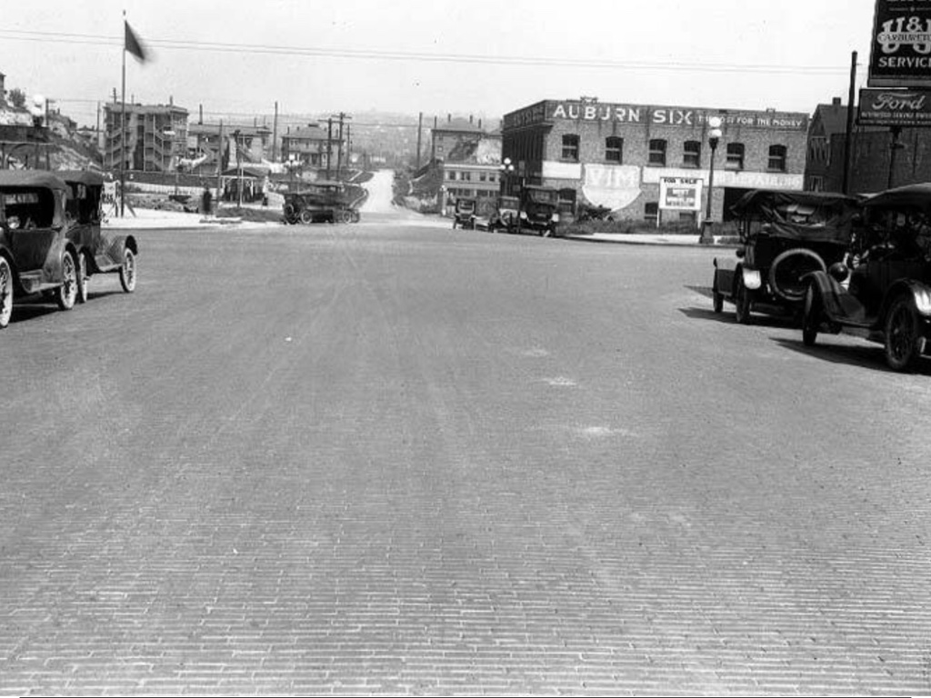 Before it was annexed to Seattle in 1910, Georgetown was a separate city connected to Seattle by streetcar. By the mid-1920s, Georgetown was just a short drive away in the family automobile. This 1925 photo shows evidence of both the old and the new transportation. Taggart Motor Company, the Ford dealership, sits on Stanley Avenue near the streetcar tracks. The old Georgetown city hall with its pointed clock tower is in the right background.